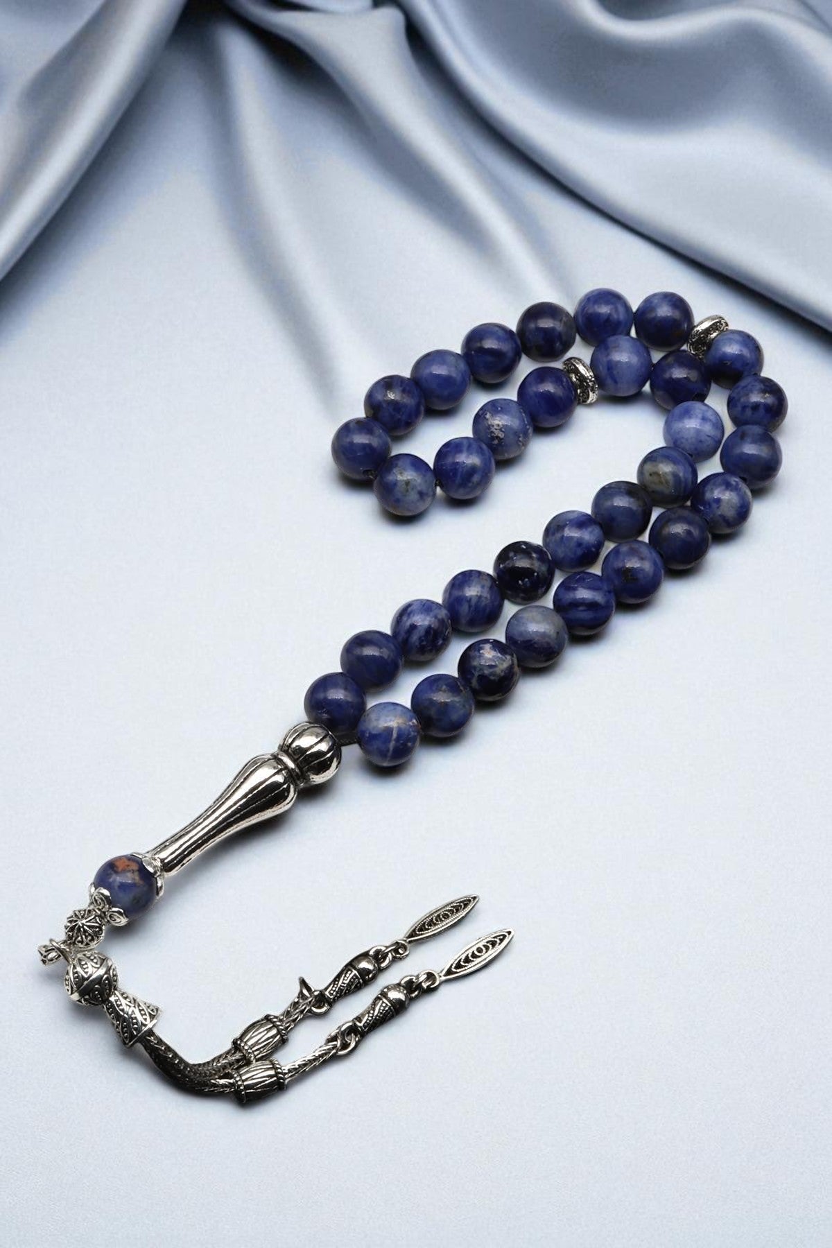 Mavi tonları ve doğal beyaz damar yapısıyla dikkat çeken %100 doğal sodalit taşları, özenle seçilip 8 mm küre kesim formunda işlenerek şık bir tesbih tasarımında bir araya getirildi.