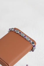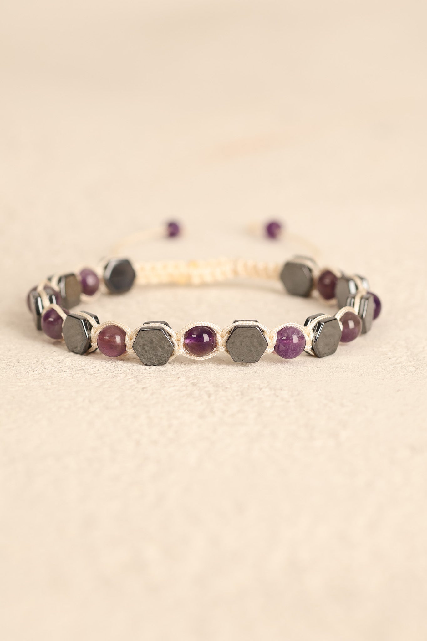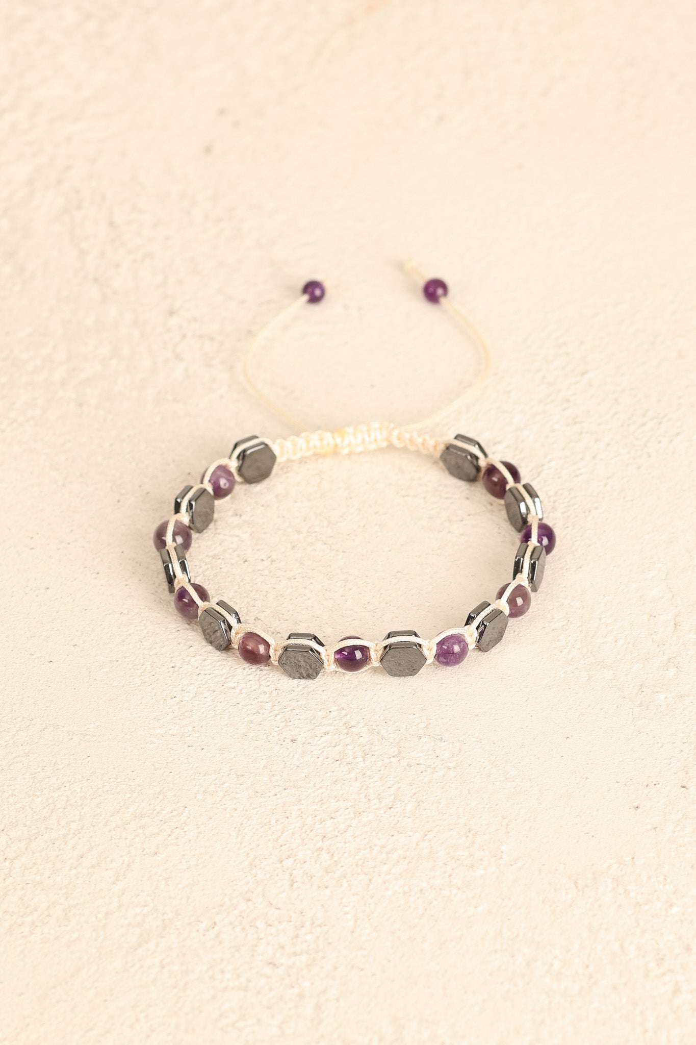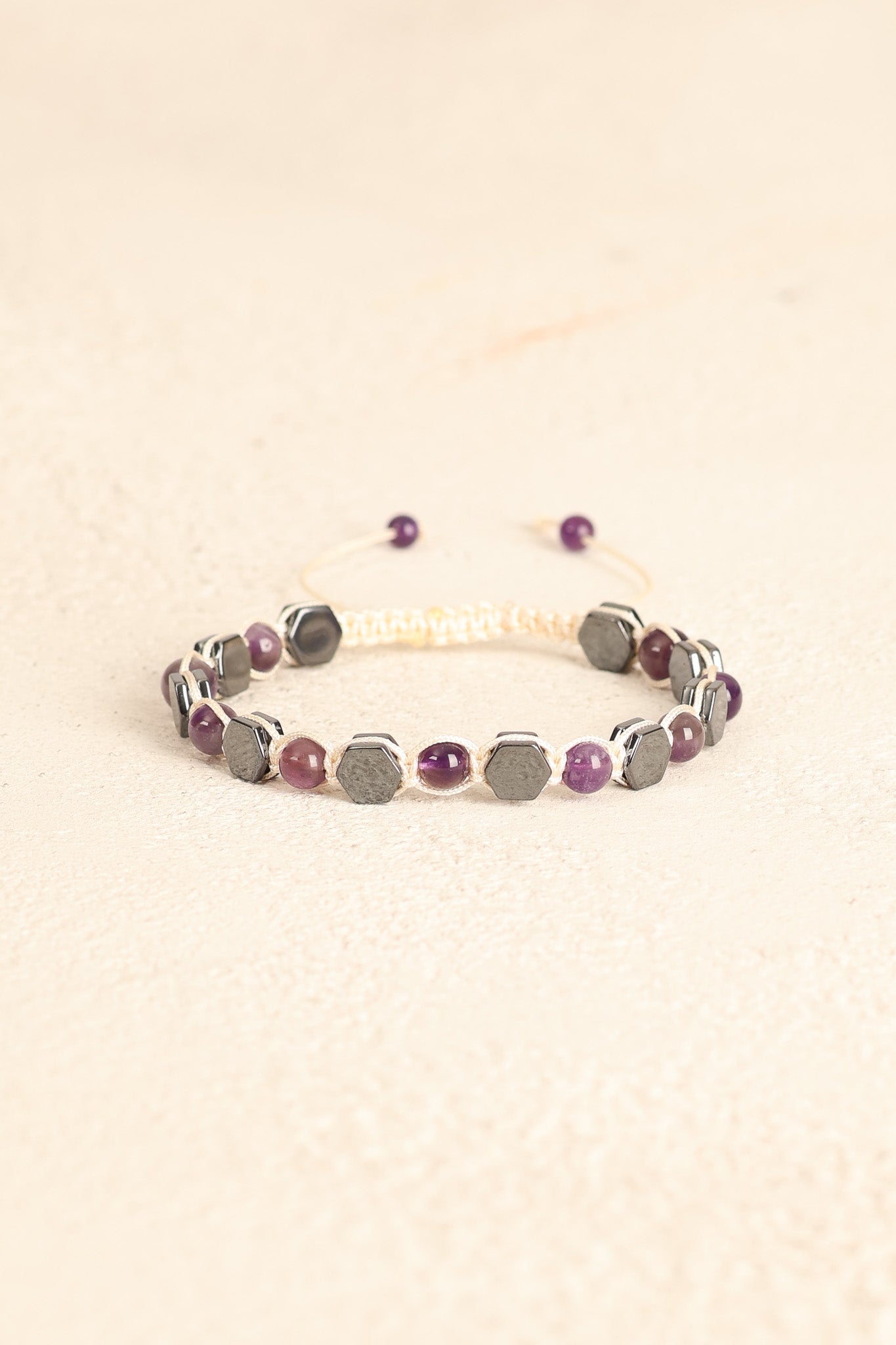 Ametistin doğal mor tonları, ışığa göre değişen etkileyici bir derinlik sunarken; hematit taşının gri metalik yansımaları bilekliğe modern bir dokunuş kazandırır. El işçiliğiyle örülen makrome ip, uzun süreli kullanım için sağlam ve konforludur.