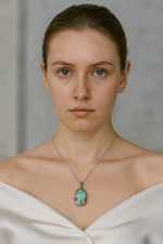 Su yeşili ile açık mavi tonlar arasında geçişler sunan doğal amazonit taşı, bu zarif kolyede sade ve modern bir tasarımla buluşuyor. Taşın doğal yüzeyindeki mat doku ve huzur veren renk yapısı, gümüş renkli detaylarla uyum içinde boyunda ferah, sakin ve dengeli bir görünüm sunar.