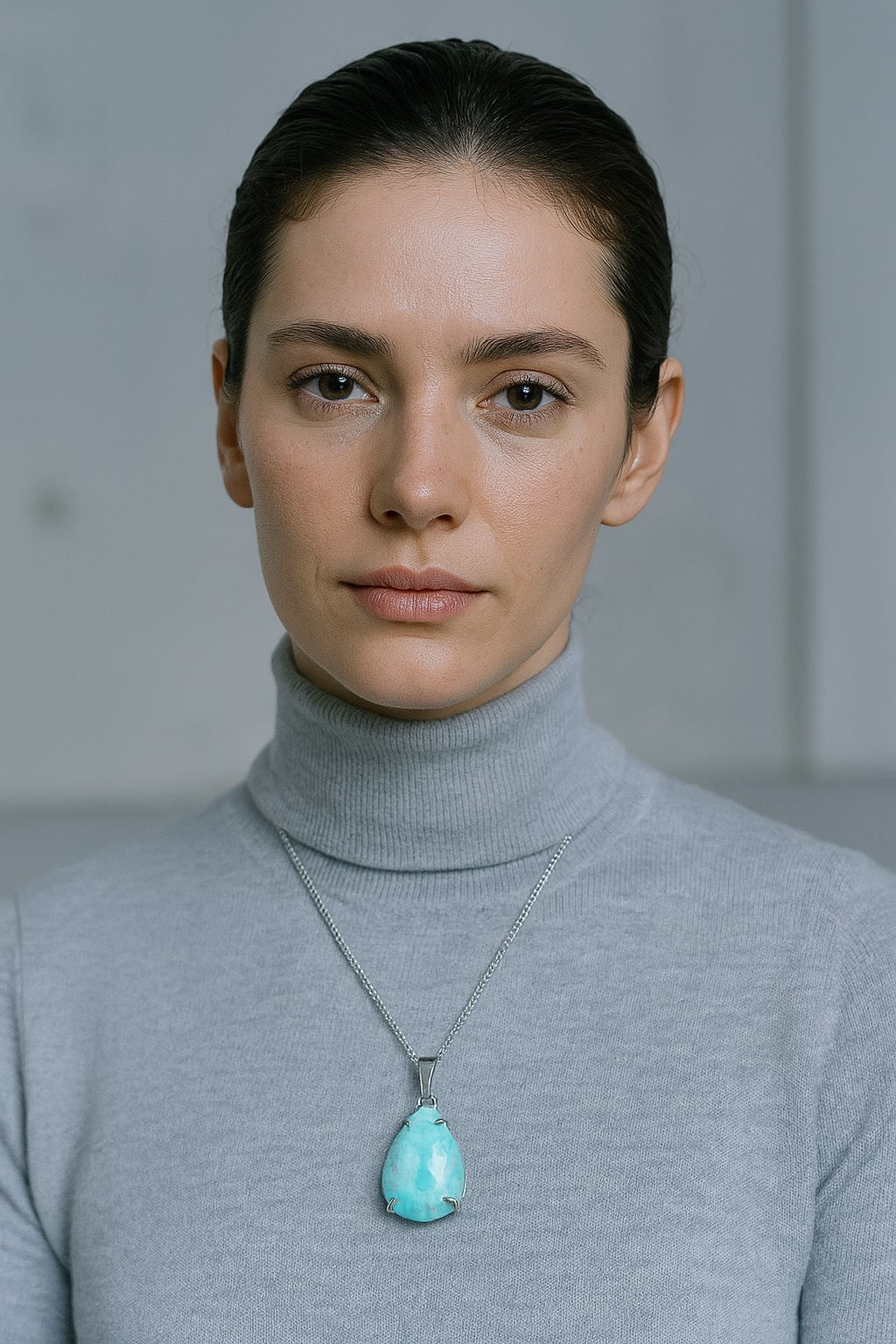 Doğanın en özel tonlarından biri olan su yeşiliyle mavi arasında değişen renk geçişlerine sahip amazonit taşı, bu zarif kolyede sade formuyla öne çıkıyor. Taşın doğal mat dokusu ve huzur veren tonları, boyunda yumuşak ve dengeli bir etki bırakır.