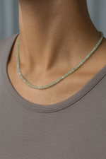 Doğal deniz köpüğü tonlarıyla öne çıkan %100 doğal amazonit taşları, modern 3-4 mm fasetli kesim formuyla zarif bir kolyede buluştu.