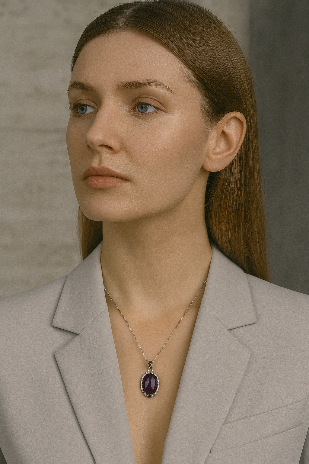 Derin mor tonlara sahip doğal ametist taşı, bu zarif kolyede 1,5 cm genişliğinde ve 2 cm uzunluğunda özenle kesilmiş formuyla, kaliteli 925 ayar gümüş çerçeveyle tamamlanmıştır. 4,3 gram ağırlığındaki bu özel tasarım, boyunda asil, dengeli ve zarif bir duruş sunar.