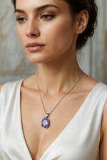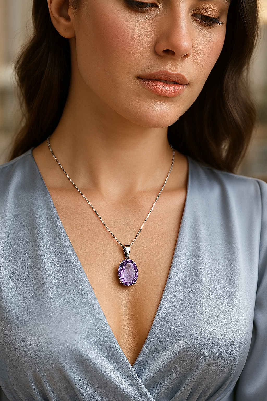 Morun asil tonlarını yansıtan %100 doğal ametist taşı, 925 ayar saf gümüş detaylarla buluşarak zarif ve modern bir kolye tasarımına dönüşüyor.