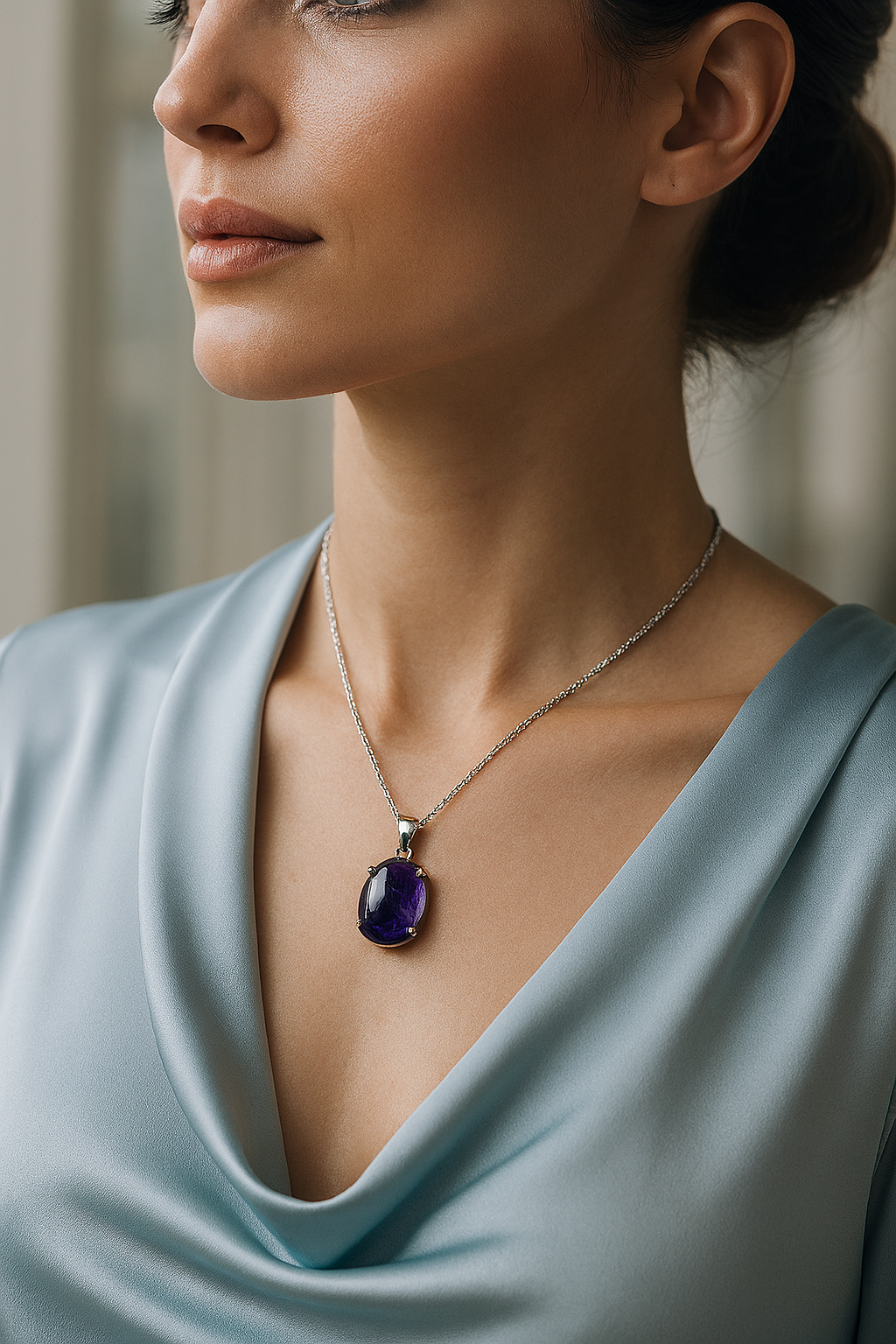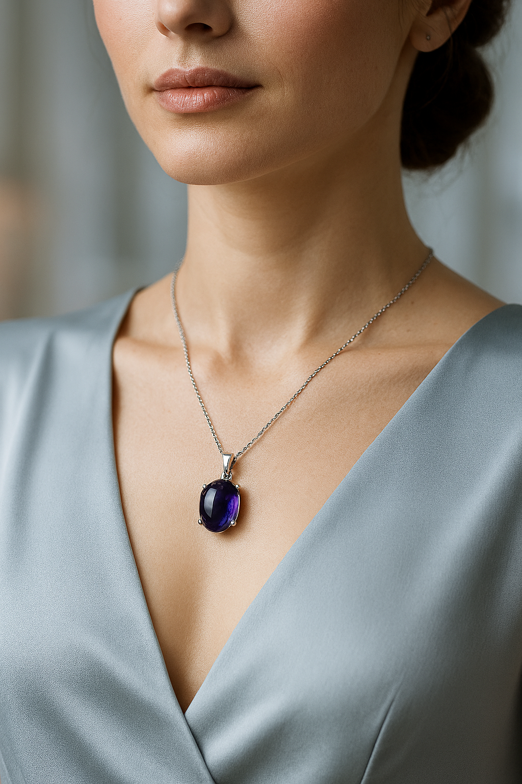 Morun asil tonlarını yansıtan %100 doğal ametist taşı, 925 ayar saf gümüş detaylarla birleşerek zarif ve modern bir kolye tasarımına dönüşüyor.