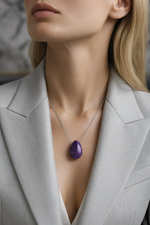 Derin mor ve lavanta tonlarının doğal berraklığıyla dikkat çeken ametist taşı, bu özel kolyede 2 cm genişliğinde ve 3 cm uzunluğunda, zarif damla formuyla şekillendirilmiştir. Kolye ucu, ışığı yumuşakça yansıtan pürüzsüz yüzeyiyle boyunda asil ve akıcı bir duruş sergiler.