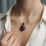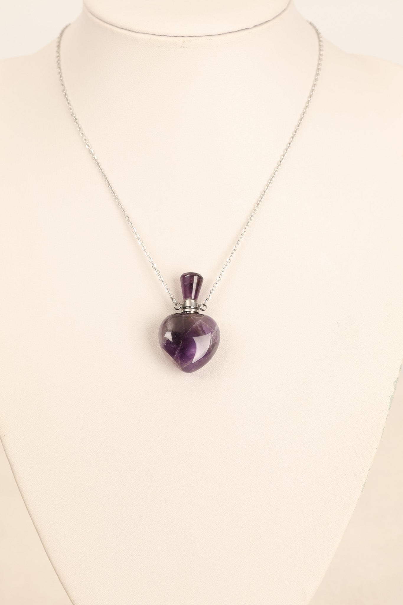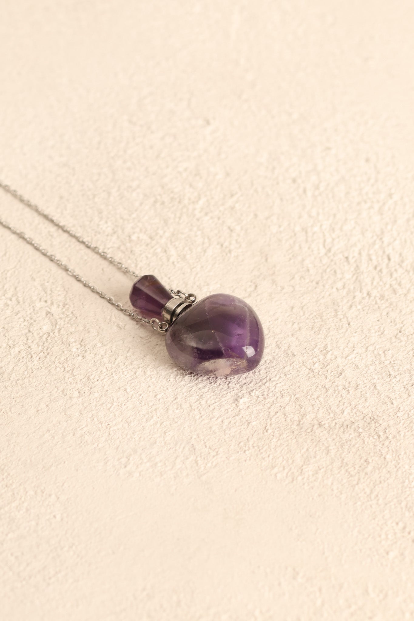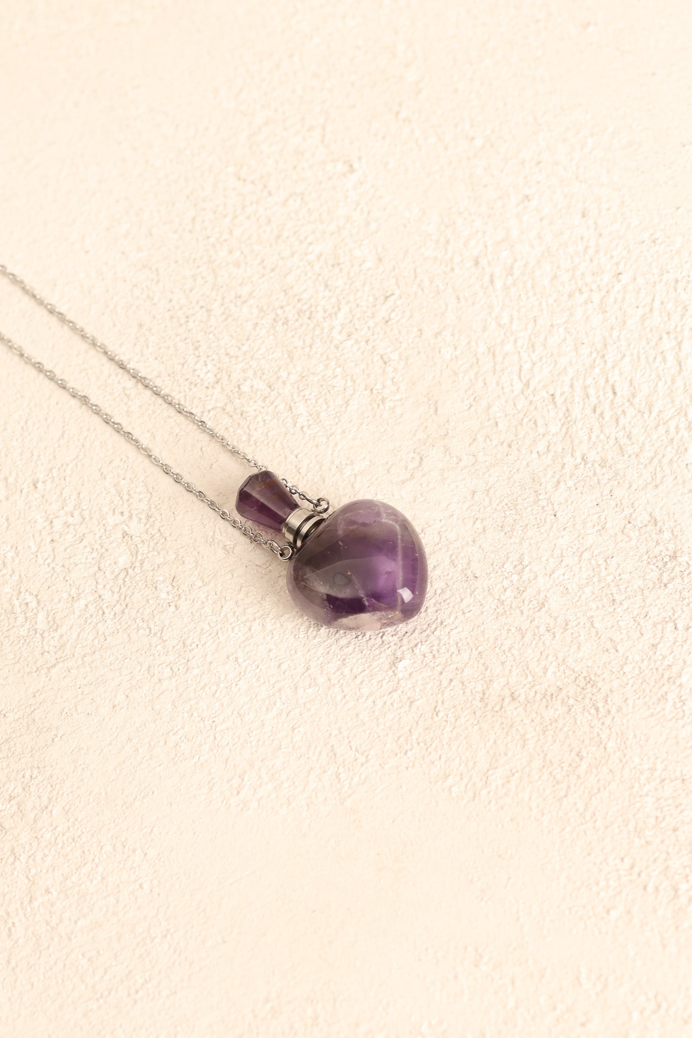 Derin mor tonlarıyla dikkat çeken %100 doğal ametist taşı, zarif esans haznesi formunda tasarlanarak hem estetik hem de fonksiyonel bir kolye haline getirilmiştir.