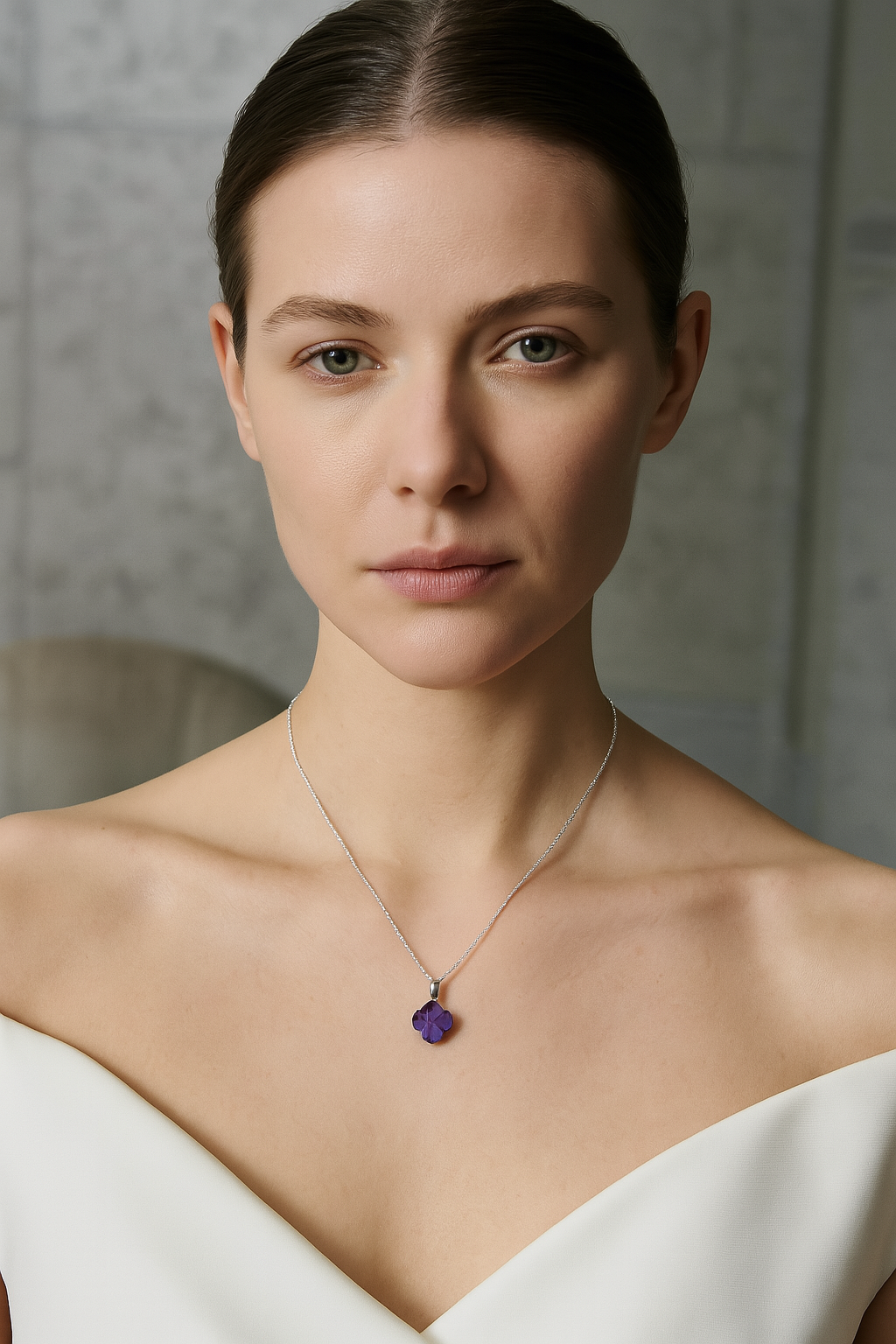 Pirtash kalitesiyle ametist taşının zarafetini ve yonca formunun şans getiren enerjisini boynunuzda taşıyın.