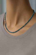 Canlı mavi tonlarıyla öne çıkan %100 doğal apatit taşları, modern 3-4 mm fasetli kesim formuyla zarif ve şık bir kolyede buluştu.