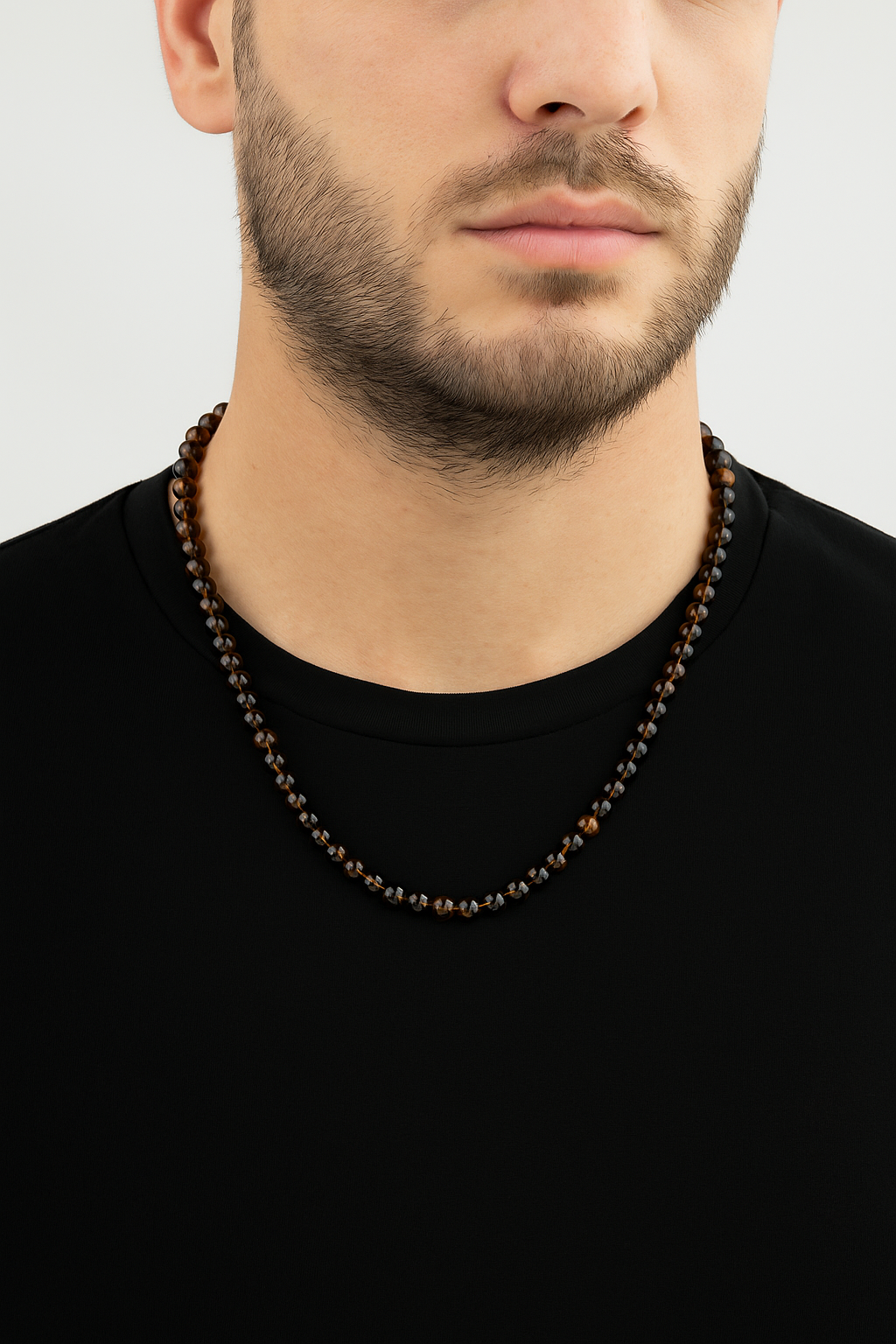 Koyu gri ve kahverengi tonlarının yarı saydam yapıyla buluştuğu dumanlı kuvars taşı, bu özel kolyede 6 mm yuvarlak kesim formunda dizilmiş ve sade, güçlü bir tasarıma dönüştürülmüştür. Her taş, ışıkla birlikte yumuşak bir derinlik sunar ve boynunuzda zarif bir siluet oluşturur.