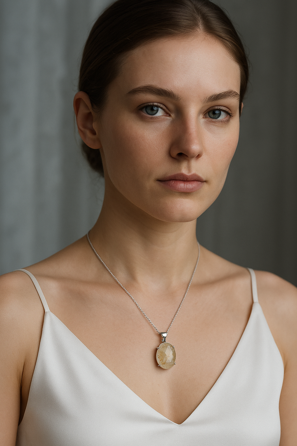Kristal berraklığı içinde altın sarısı iğne benzeri doğal lifler barındıran golden rutilli kuvars taşı, bu eşsiz kolyede yüksek kaliteli 925 ayar gümüş detaylarla tamamlanmıştır. Her taşın içindeki altın renkli doğal hatlar, ışıkla birlikte canlanarak boyunda sofistike, büyüleyici ve zarif bir görünüm sunar.