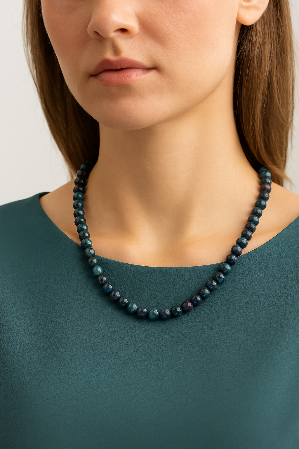 Koyu yeşil zemin üzerinde doğal olarak dağılmış kırmızı benek ve damar yapısıyla tanınan kan taşı (heliotrop), bu özel kolyede 6 mm yuvarlak kesim formunda dizilmiş ve güçlü bir stilin temsilcisi hâline getirilmiştir. Taşların eşsiz kontrastı, boynunuzda kararlı ve doğal bir duruş sergiler.