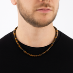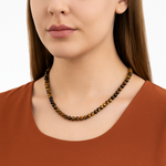 Altın sarısı, bronz ve kahverengi tonlarının ışıkla dans ettiği kaplan gözü taşı, bu özel kolyede 6 mm yuvarlak kesim formunda dizilmiş ve sade, zarif bir tasarımla bütünleştirilmiştir. Taşların kendine özgü ipeksi parlaklığı, boynunuzda güçlü ve sofistike bir duruş sergiler.
