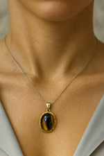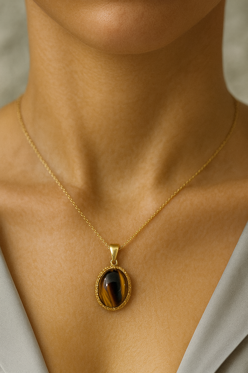 Altın kahverengi yansımaları ve karakteristik çizgili dokusuyla öne çıkan %100 doğal kaplan gözü taşı, 925 ayar saf gümüş detaylarla birleşerek şık ve güçlü bir kolye tasarımına dönüşüyor.