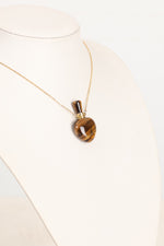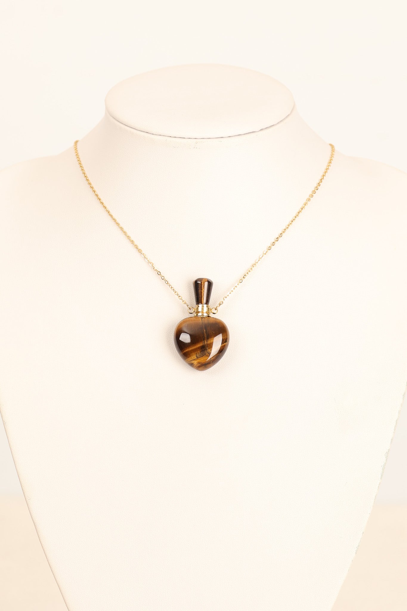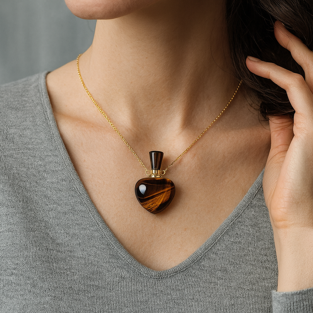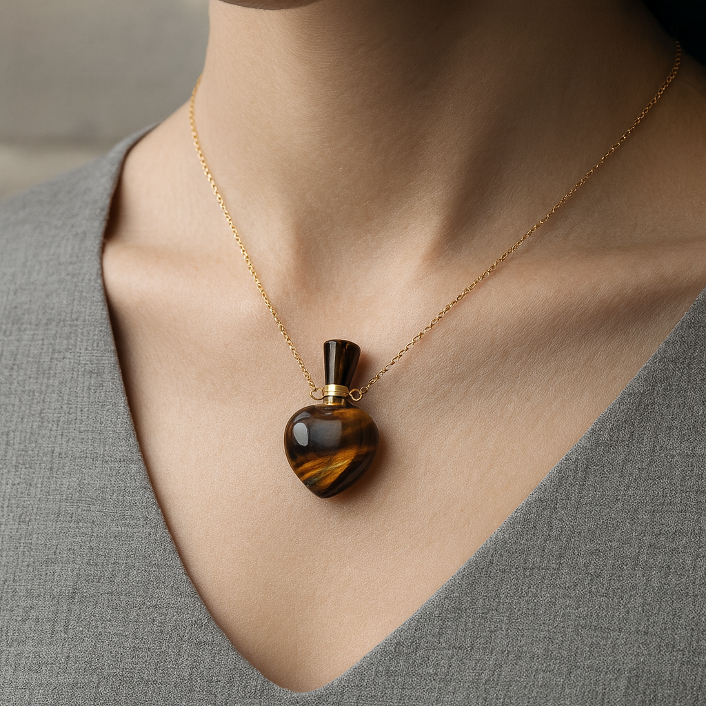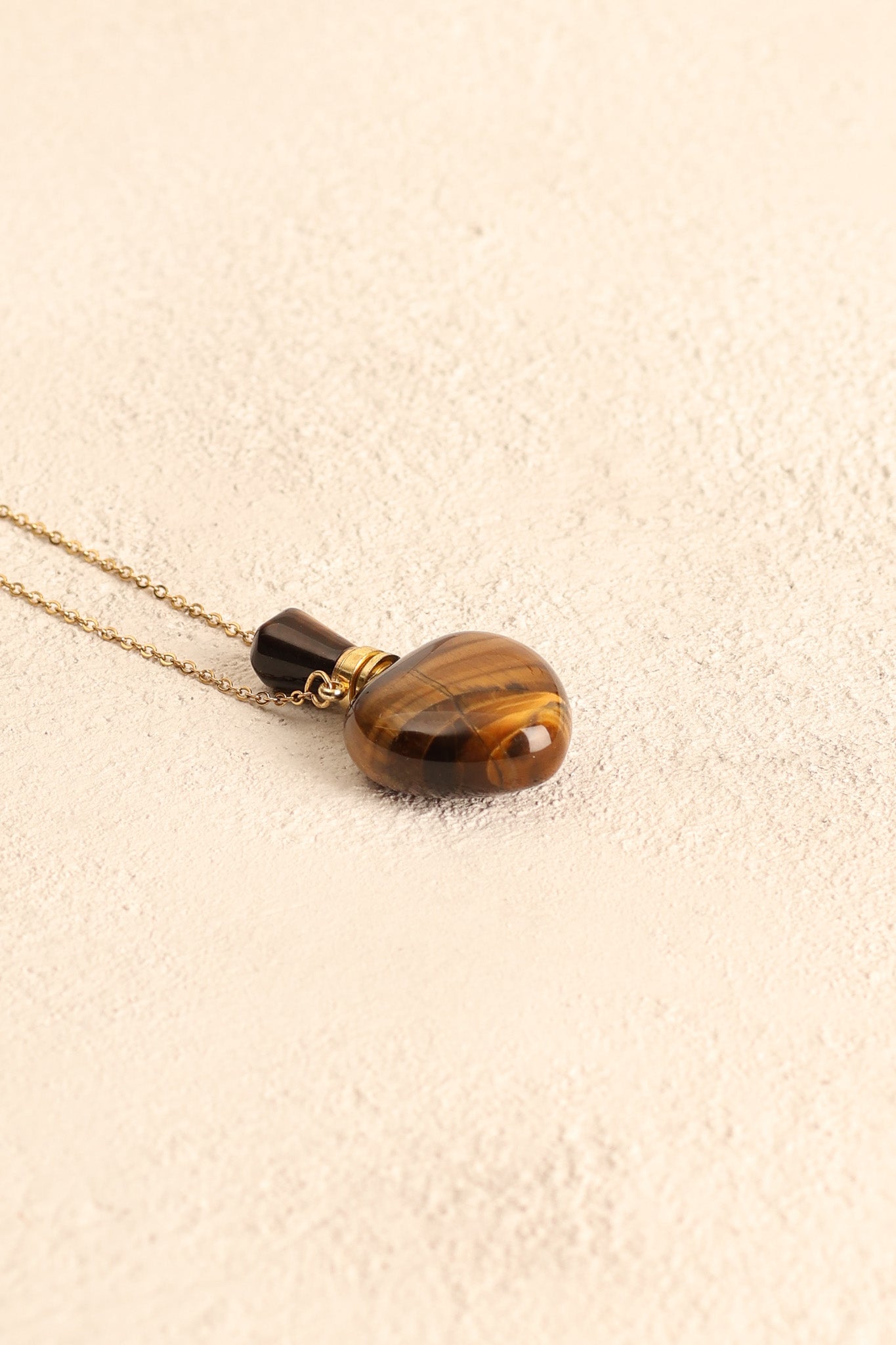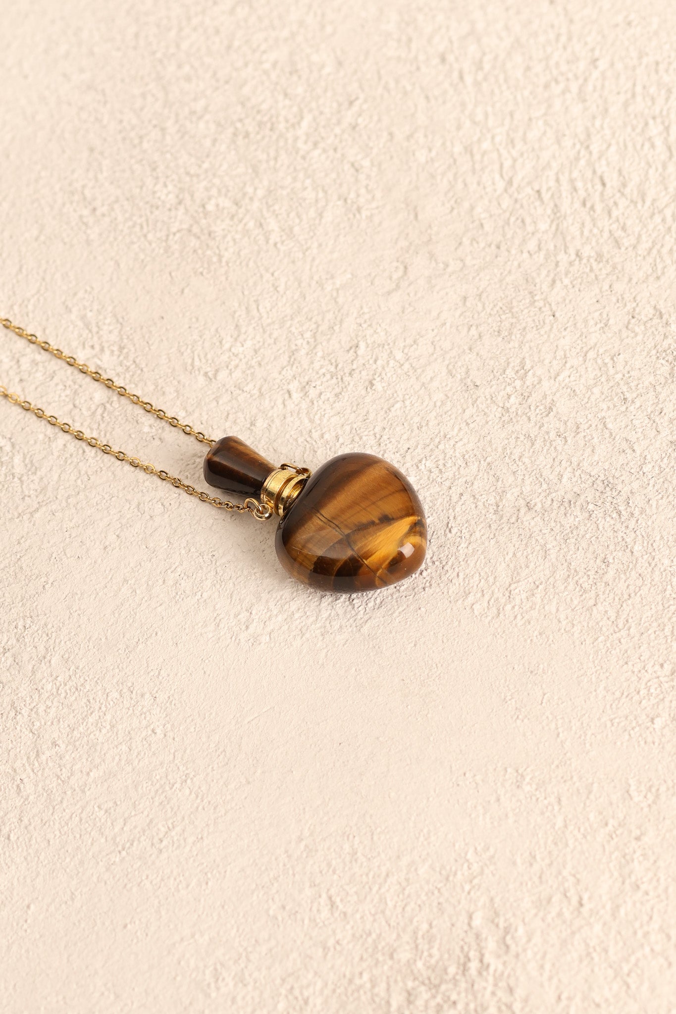 Altın kahverengi çizgili yapısıyla dikkat çeken %100 doğal kaplan gözü taşı, zarif esans haznesi formunda tasarlanarak hem estetik hem de fonksiyonel bir kolye haline getirilmiştir.