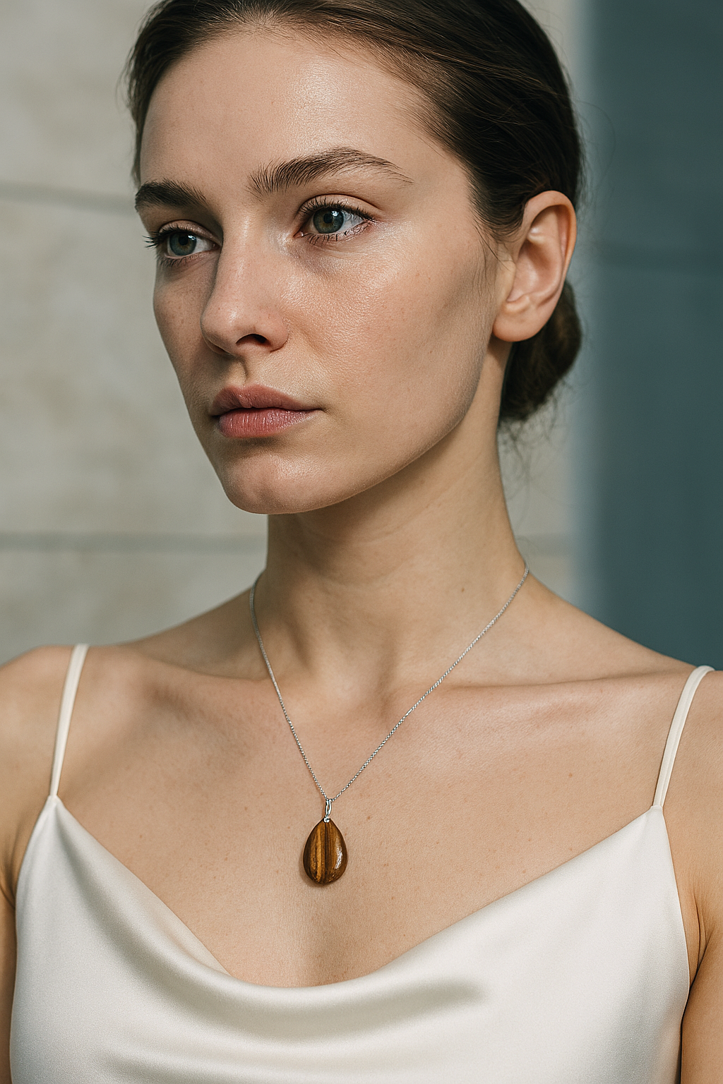 Kaplan gözü taşı, tarih boyunca cesaret, özgüven ve odaklanmanın simgesi olarak kabul edilmiştir. Doğal desenleri sayesinde her kolye benzersizdir. Günlük stilinize karakter katmak ve zarif bir doğallık taşımak isteyenler için mükemmel bir seçimdir.
