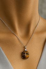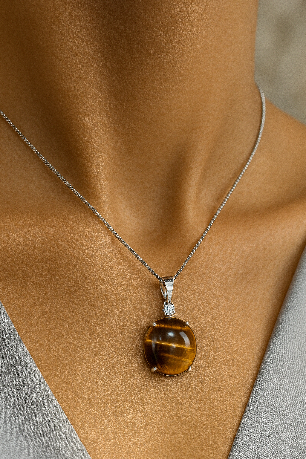 Altın kahverengi yansımaları ve karakteristik çizgili dokusuyla dikkat çeken %100 doğal kaplan gözü taşı, zarif bir kolye tasarımına dönüştü.