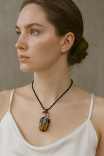 Altın sarısı yansımalarıyla kaplan gözü taşı ve mavi-yeşil ışık oyunlarıyla öne çıkan labradorit taşı, bu özel kolyede doğanın iki etkileyici taşını aynı formda buluşturuyor. Işıkla birlikte hareket eden yansımalar ve doğal damar yapıları sayesinde boyunda dikkat çekici, dengeli ve mistik bir duruş sergiler.