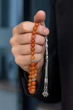 Tarçın, kiremit ve canlı turuncu tonlarının yarı saydam yapıyla birleştiği karnelyan akik taşı, bu özel tesbihte 8 mm küre kesim formunda dizilmiş ve 33’lük geleneksel tesbih dizilimiyle hazırlanmıştır. Her taşın yüzeyinde doğal renk geçişleri ve sıcaklık hissi belirgindir.