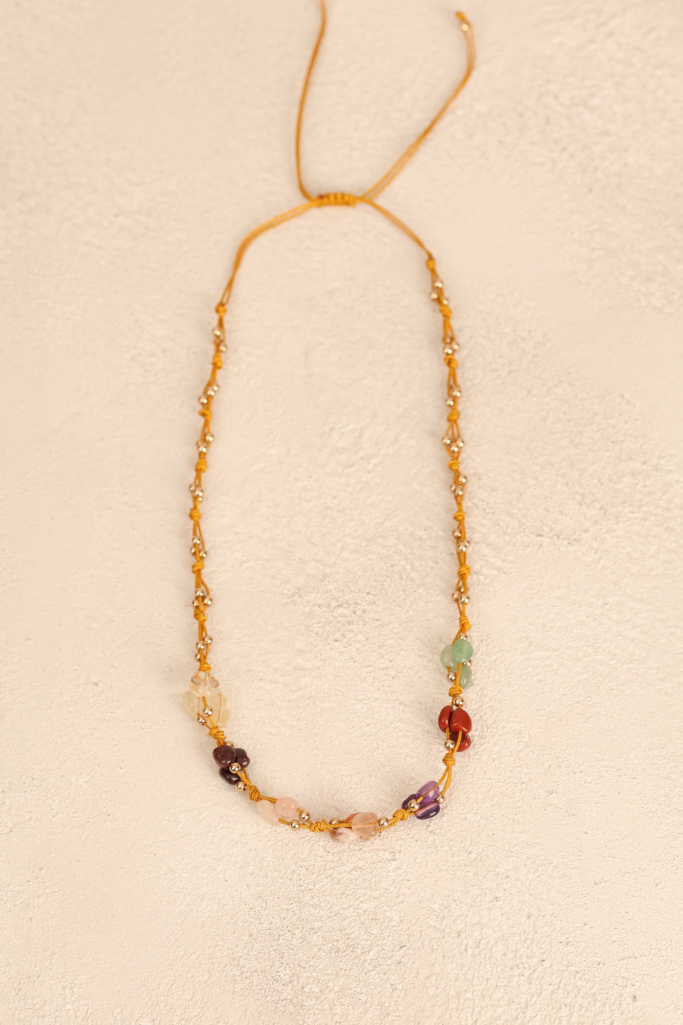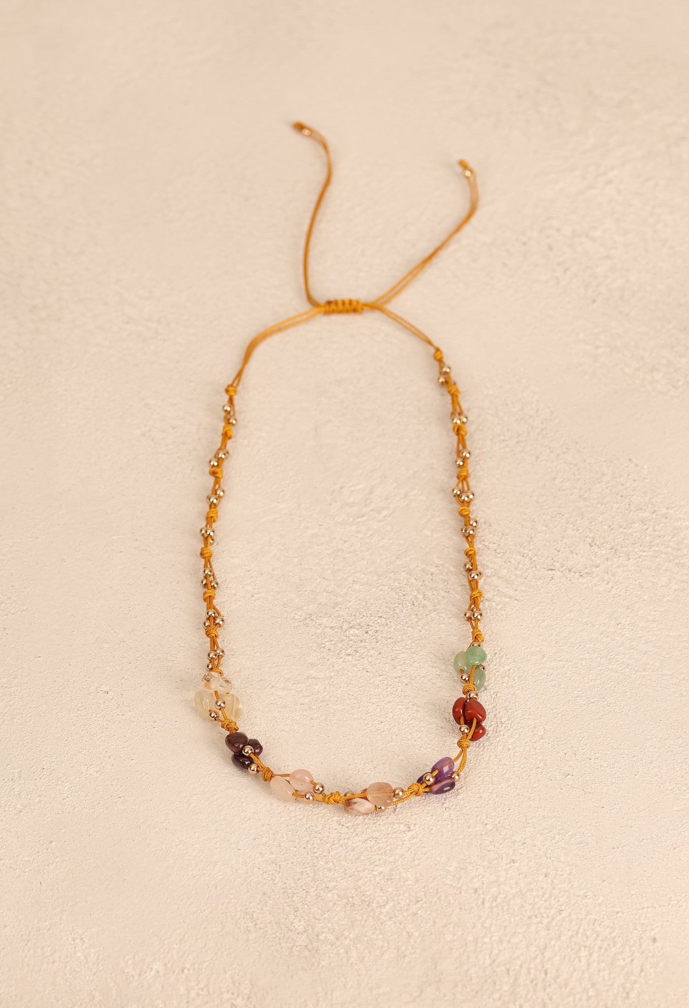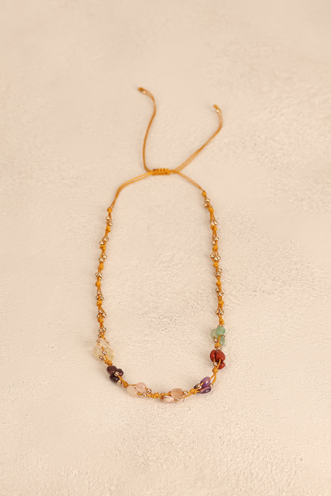 El işçiliğiyle hazırlanmış ayarlanabilir makrome tasarım, farklı boyun ölçülerine kolayca uyum sağlar. Hem günlük kullanım hem de özel günlerde zarif bir tamamlayıcıdır.