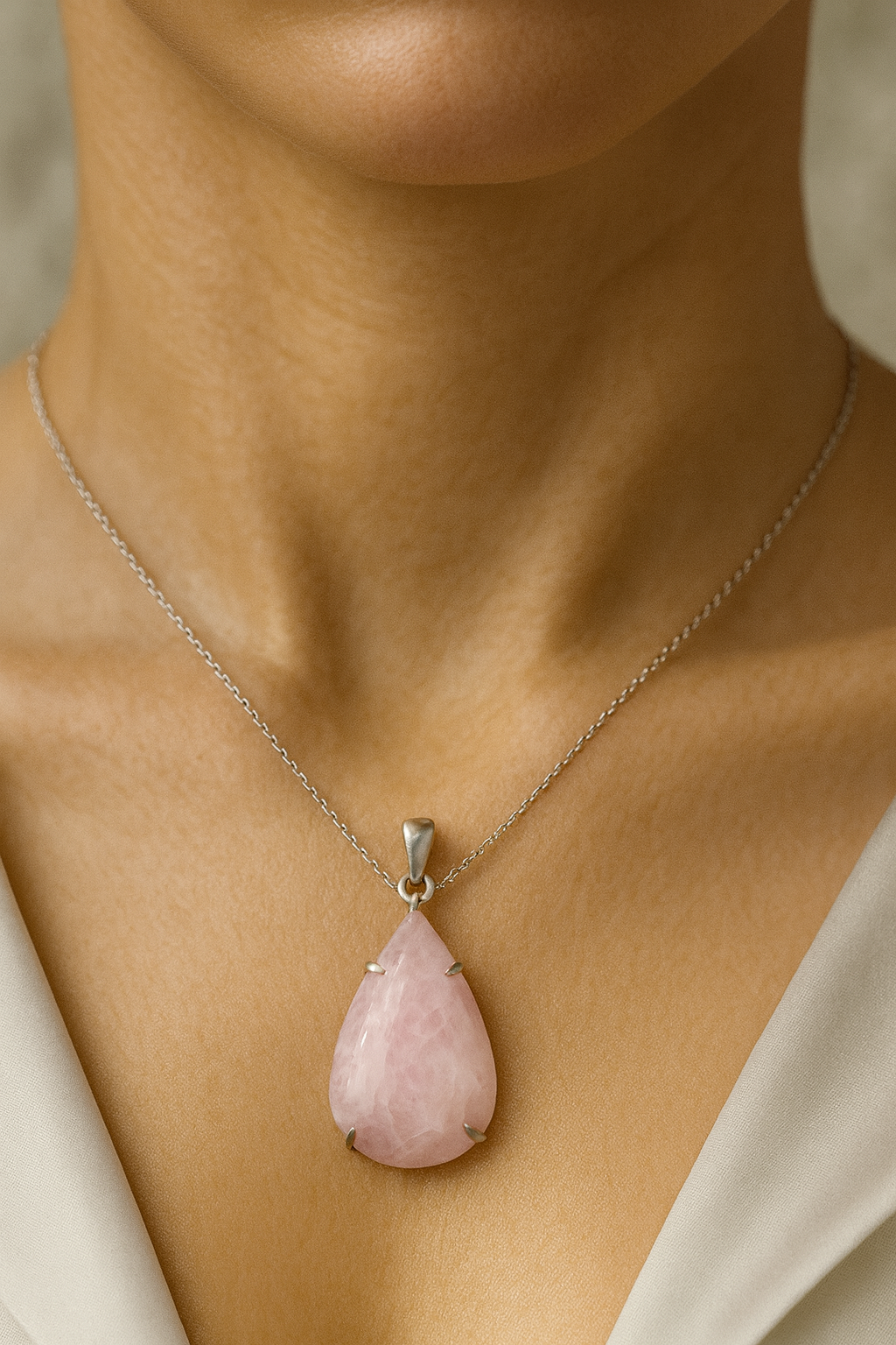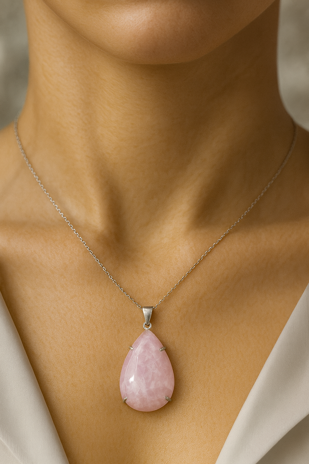 Pirtash ile kunzit taşının zarif tonlarını, gümüşün şıklığı ve bilimsel güvenceyle boynunuzda taşıyın.