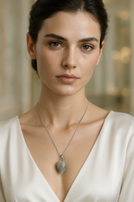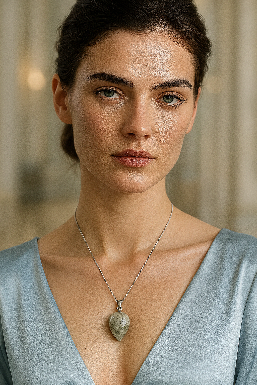 Taşın doğal parlaklığı ve yansıma oyunları sayesinde her kolye tek ve benzersizdir.