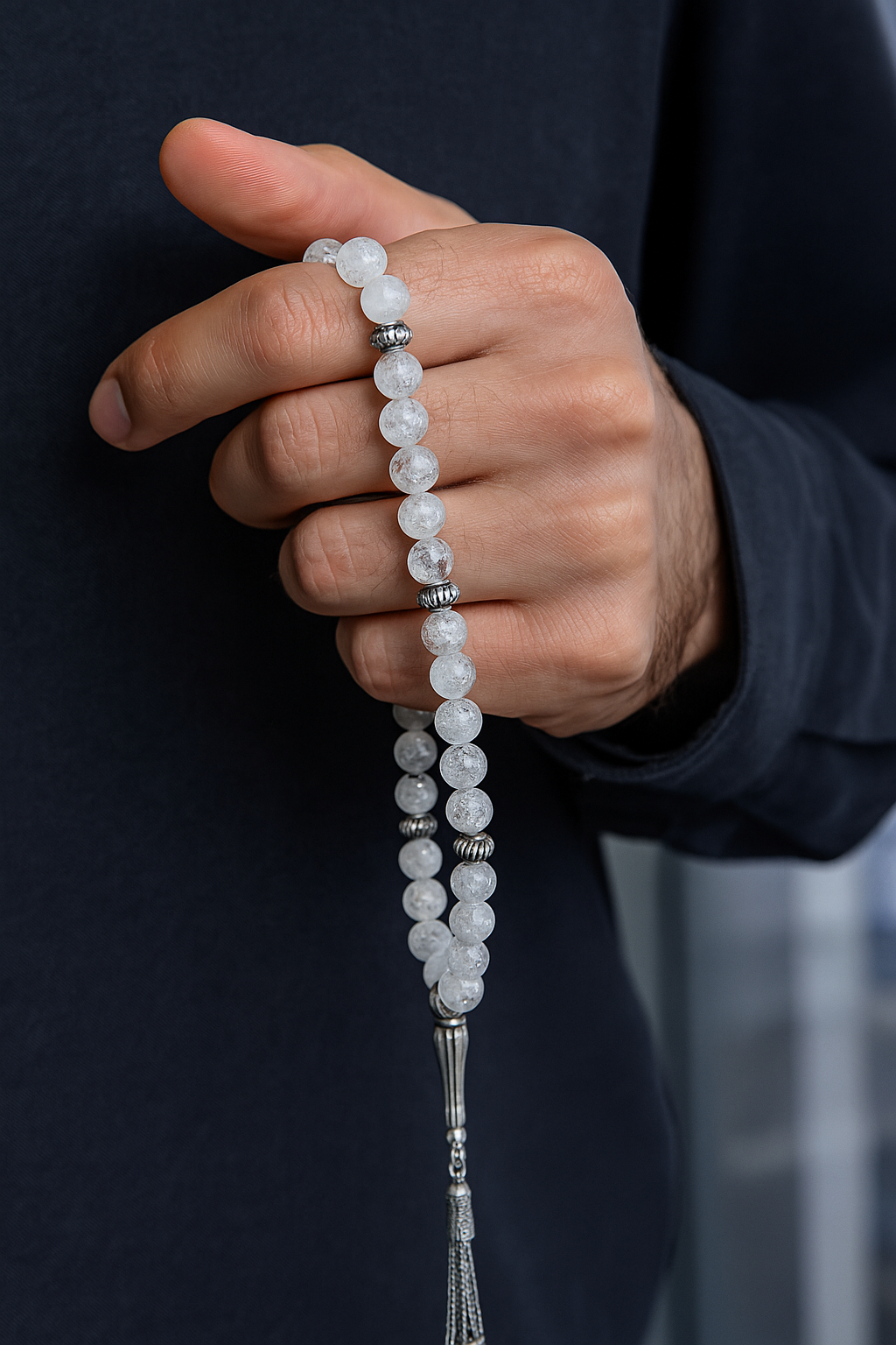Kristal berraklığındaki yapısıyla tanınan, ışığı güçlü şekilde yansıtan ve saf şeffaf formuyla öne çıkan necef taşı, bu özel tesbihte 8 mm küre kesim formunda hazırlanmış ve 33 adet doğal taşla geleneksel dizilimde sunulmuştur. Her taşın içinde yer alan küçük doğa izleri, elde sade, saf ve huzurlu bir duruş sergiler.