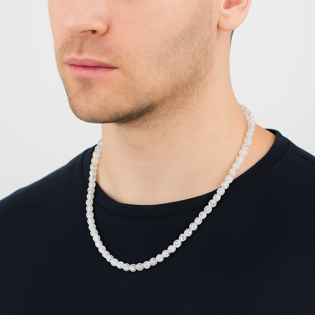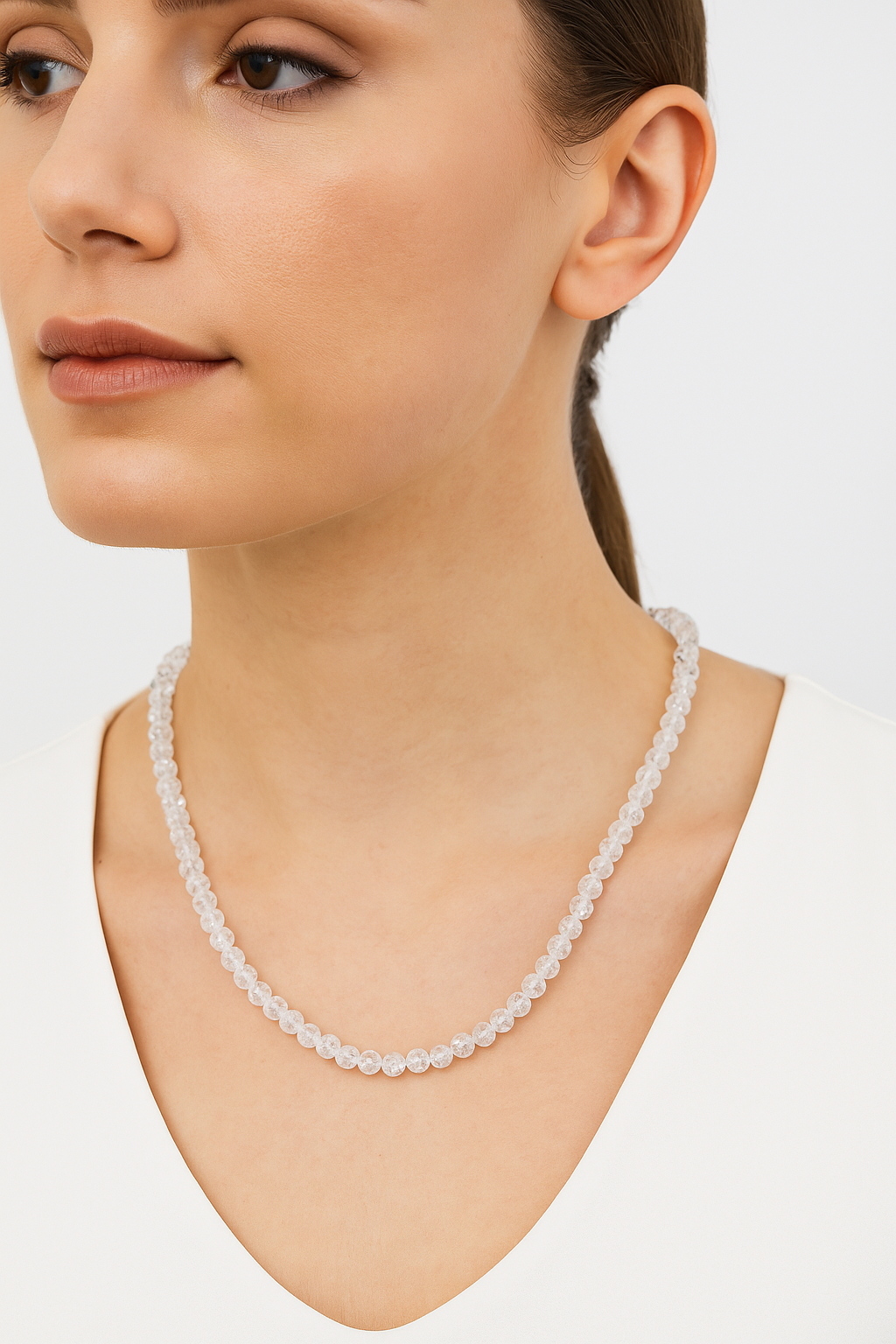 Cam parlaklığına sahip, saf berraklığıyla tanınan necef taşı (diğer adıyla dağ kristali), bu özel kolyede 6 mm yuvarlak kesim formunda dizilmiş ve sade, zarif bir tasarımla sunulmuştur. Taşların ışığı yansıtma gücü, boynunuzda ferah ve duru bir görünüm oluşturur.