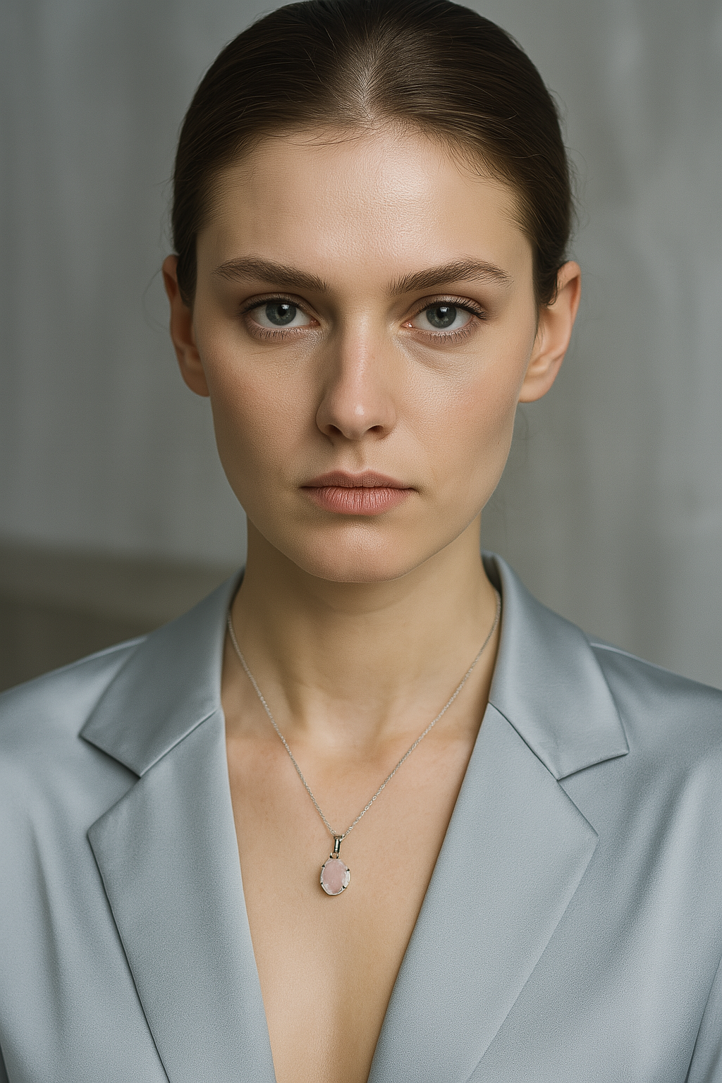 Yumuşak pembesiyle huzur, şefkat ve zarafeti simgeleyen doğal pembe kuvars taşı, bu özel kolyede sade ama etkileyici bir formda sunulmuştur. Taşın yarı saydam yapısı ve doğal parlaklığı, boyunda nazik, dengeli ve estetik bir duruş sergiler.