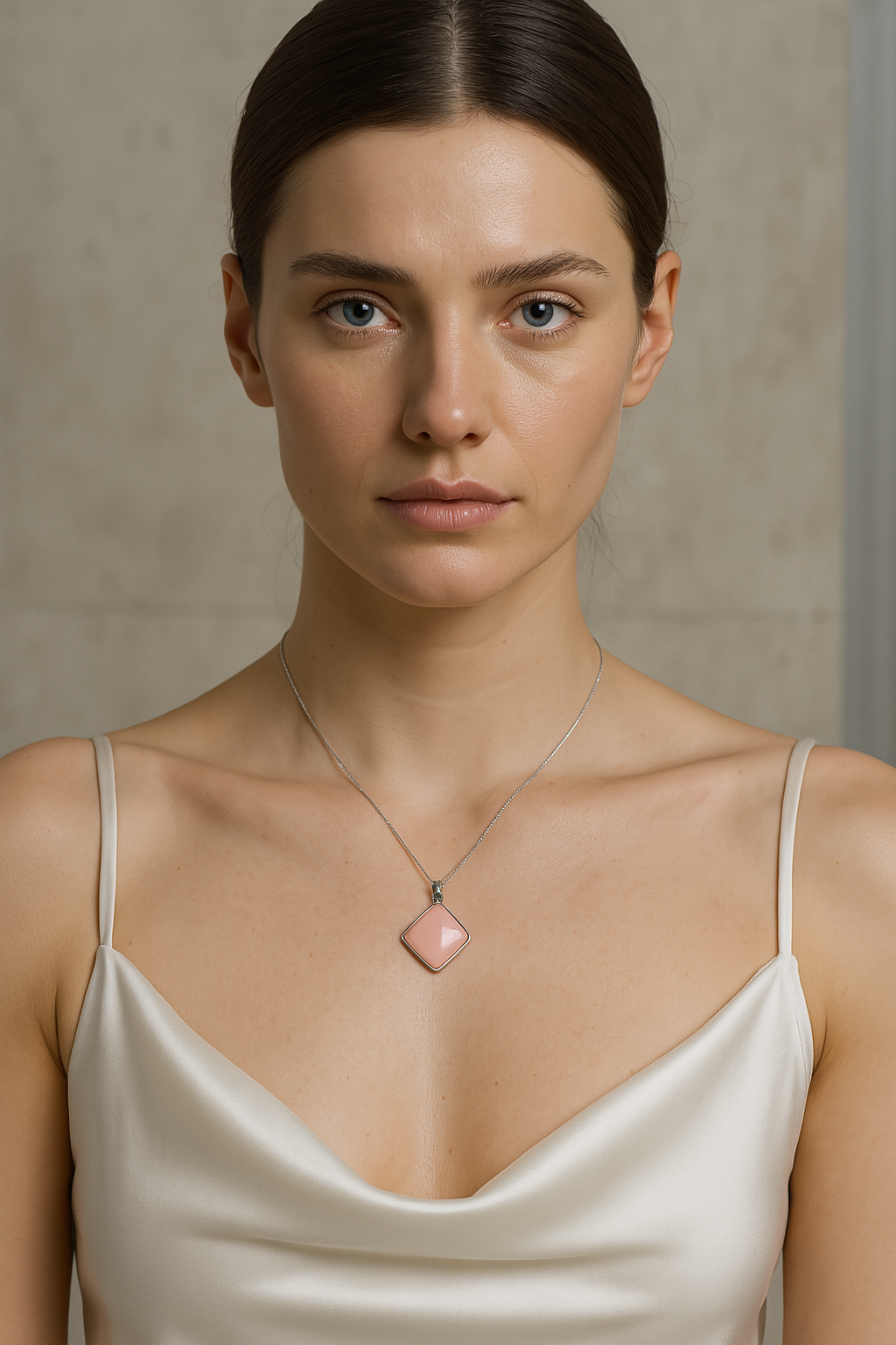 Yumuşak pembe tonları ve yarı saydam yapısıyla bilinen doğal pembe kuvars taşı, bu özel kolyede zarif bir piramit kesim formunda sunulmuştur. Simetrik yüzeyleri ve doğal parlaklığı sayesinde taş, boyunda dengeli, zarif ve huzur veren bir etki oluşturur.