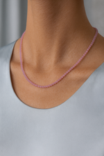 Canlı ve zarif pembe tonlarıyla öne çıkan %100 doğal pembe turmalin taşı, modern bir kolye tasarımında hayat buluyor.
