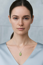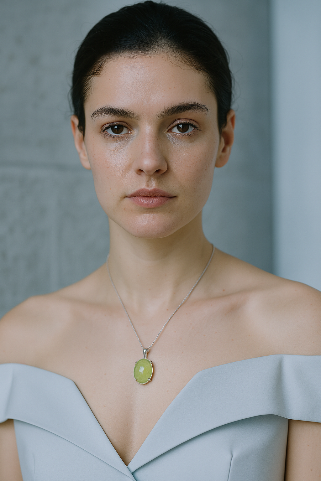 Yumuşak yeşil tonları ve iç dokusundaki hafif puslu yapı ile tanınan doğal prehnite taşı, bu özel kolyede yüksek kaliteli gümüş detaylarla tamamlanmıştır. Taşın yarı saydam ve sakin duruşu, boyunda zarif, doğal ve huzurlu bir etki bırakır.