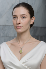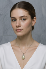 Yumuşak yeşil tonları ve iç dokusundaki hafif puslu yapı ile tanınan doğal prehnite taşı, bu özel kolyede yüksek kaliteli gümüş detaylarla tamamlanmıştır. Taşın yarı saydam ve sakin duruşu, boyunda zarif, doğal ve huzurlu bir etki bırakır.