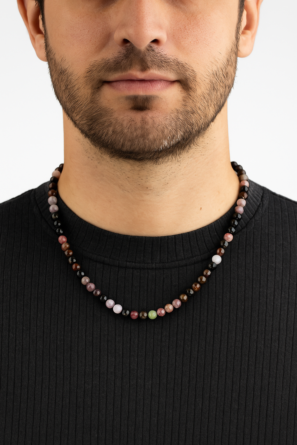 Doğanın sunduğu pembe, yeşil, kahverengi, gri ve siyah gibi zengin tonların bir araya geldiği renkli turmalin taşı, bu özel kolyede 6 mm yuvarlak kesim formunda dizilmiş ve özgün bir doku ile boynunuzda dikkat çekici bir görünüm sunar. Her taşın kendine özgü tonu, kolyeyi benzersiz kılar.