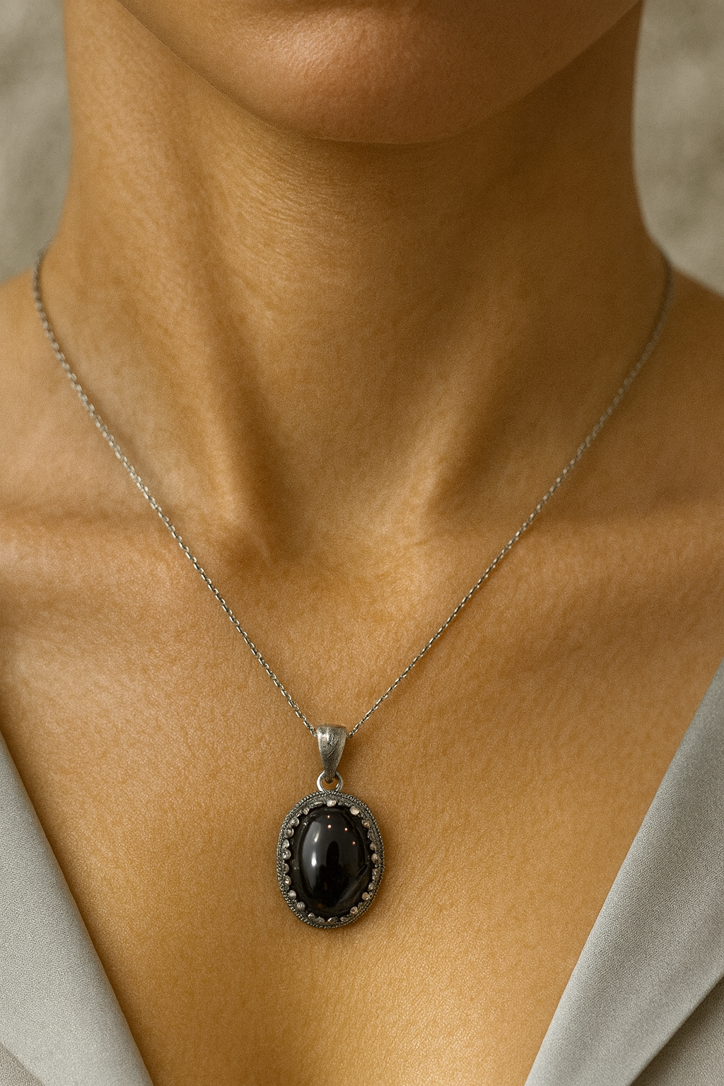 Derin siyah tonları ve kendine özgü parlak yüzeyiyle dikkat çeken %100 doğal siyah göz akik taşı, 925 ayar saf gümüş detaylarla birleşerek şık ve modern bir kolye tasarımına dönüştü.