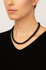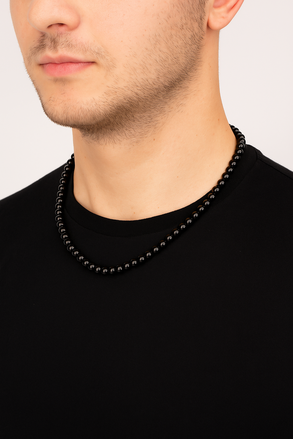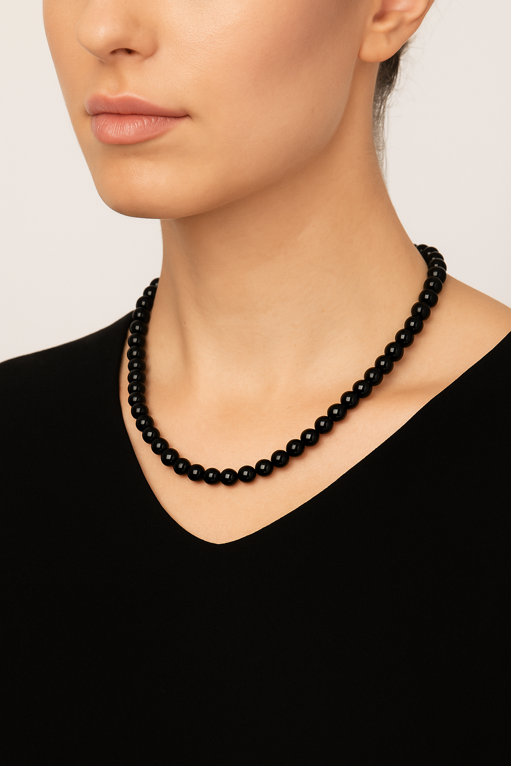 Yoğun siyah rengi, doğal parlaklığı ve güçlü karakteriyle bilinen siyah turmalin taşı, bu özel kolyede 6 mm yuvarlak kesim formunda dizilmiş ve tam dizi olarak hazırlanmıştır. Mat ile parlak yüzey geçişleri, kolyeye sade ama etkileyici bir görünüm kazandırır.