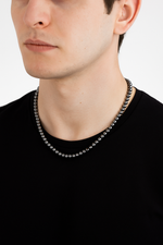 Gri, bej, açık kahverengi ve yeşilimsi tonların iç içe geçtiği doğal desenleriyle öne çıkan trehartz taşı, bu özel kolyede 6 mm yuvarlak kesim formunda dizilmiş ve sade, dengeli bir görünümle sunulmuştur. Her taşın yüzeyindeki doğal desenler, kolyeye karakterli ve toprak tonlarında bir estetik kazandırır.