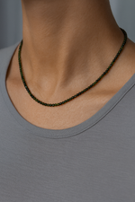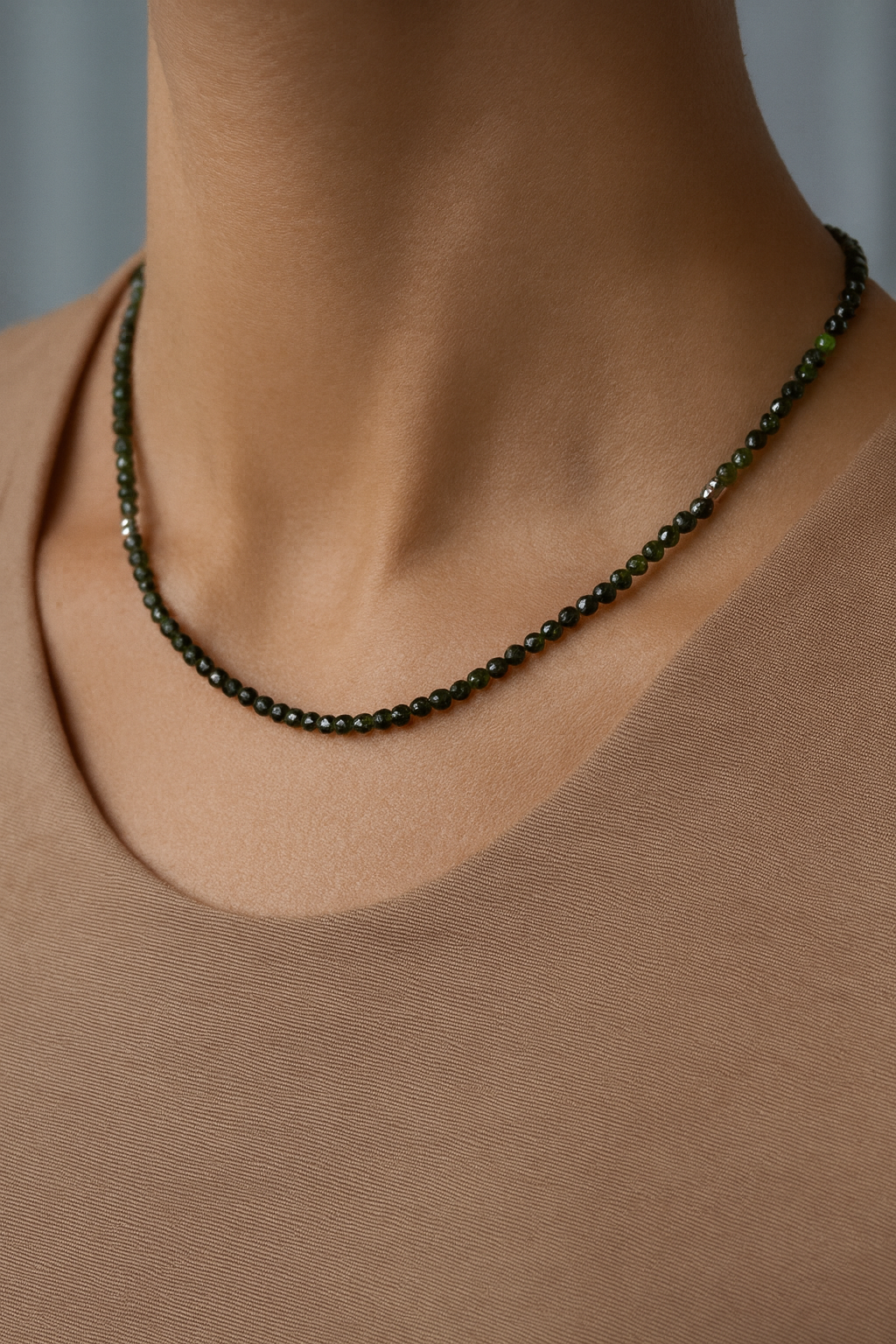 Doğal yeşil tonlarıyla öne çıkan %100 doğal yeşim taşı, zarif bir kolye tasarımında hayat buluyor.