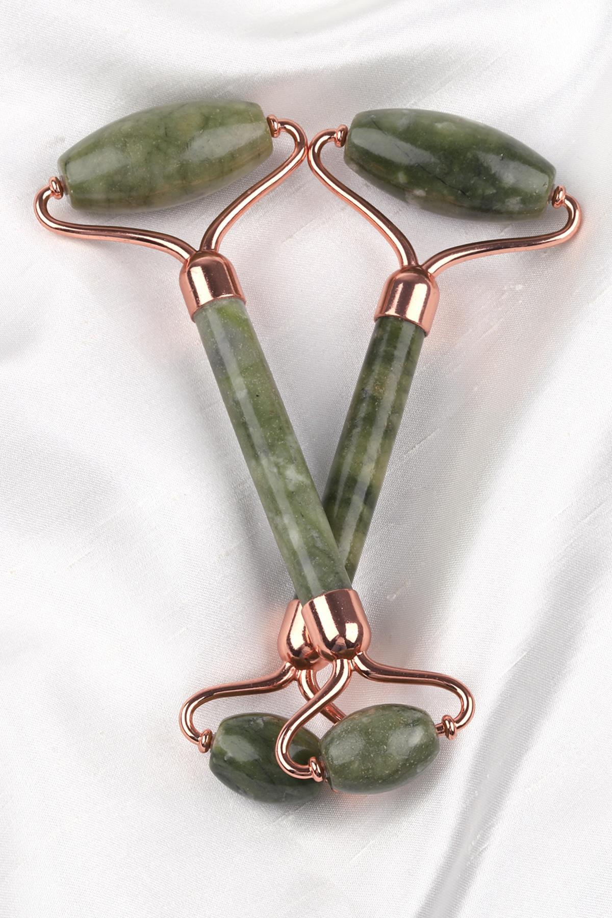 Doğal yeşil tonları ve pürüzsüz yüzeyiyle dikkat çeken %100 doğal yeşim taşı, çift taraflı silindir formuyla yüz masajı ve cilt bakım uygulamaları için özel olarak tasarlandı.