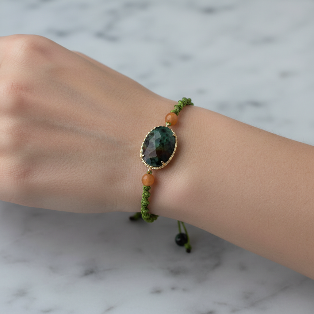 Canlı tonların uyumunu yansıtan Afrika Turkuaz – Turuncu Aventurin Doğal Taş Makrome Bileklik, özel tasarım makrome örgü tekniğiyle hazırlanmıştır. Afrika Turkuaz’ın özgün yeşil tonları, Turuncu Aventurin’in sıcak ve enerjik rengiyle birleşerek bileğe modern ve dikkat çekici bir estetik kazandırır. Ayarlanabilir yapısı sayesinde her bileğe kolayca uyum sağlar. Günlük kullanım için uygun olduğu gibi, sevdiklerinize şık ve özgün bir hediye alternatifi olarak da öne çıkar.