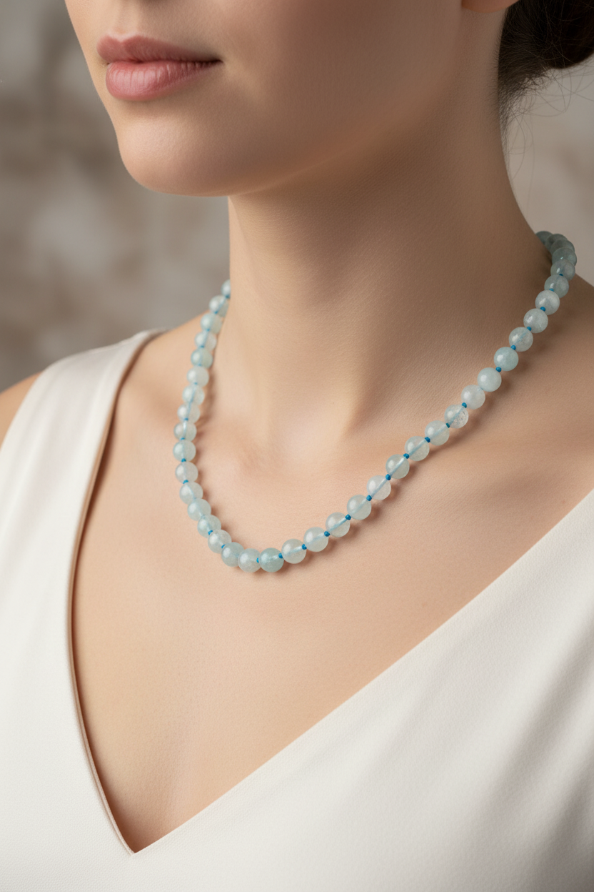 Akuamarin Doğal Taş Kolye – 8 mm Düğümlü, Unisex Tasarım