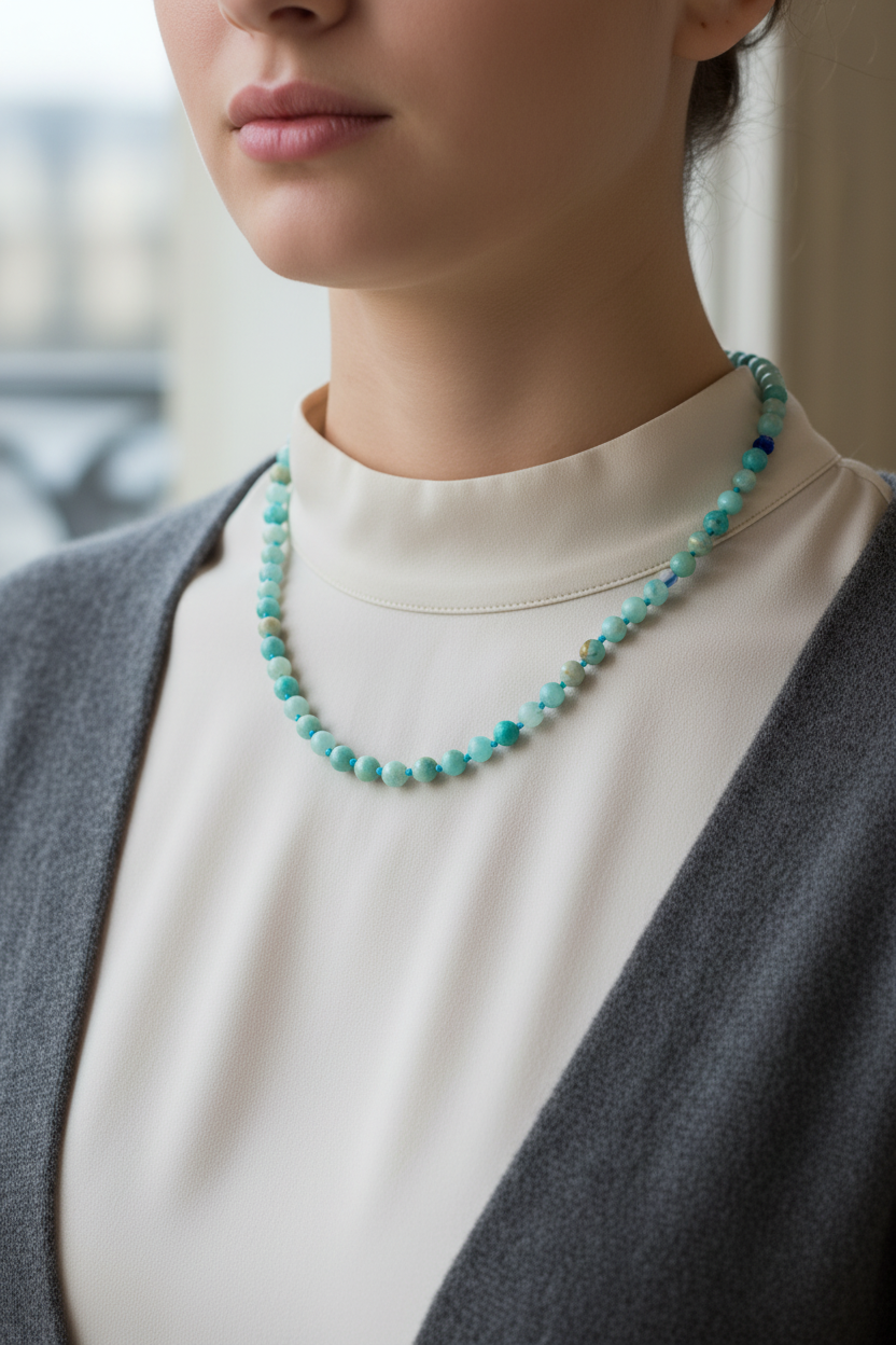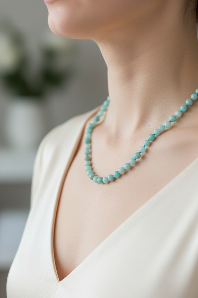Amazonit 6 mm Düğümlü Doğal Taş Kolye – Unisex El İşçiliği