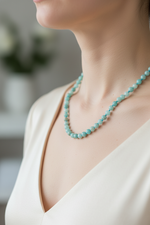 Amazonit 6 mm Düğümlü Doğal Taş Kolye, zarif ve doğal görünümüyle günlük kombinlerden özel davetlere kadar şıklığınızı tamamlayan özel bir aksesuardır. 6 mm ölçüsündeki yuvarlak doğal taş boncuklar, tek tek düğümlenerek dizilmiş ve bu işçilik sayesinde kolyenin dayanıklılığı artırılmıştır.