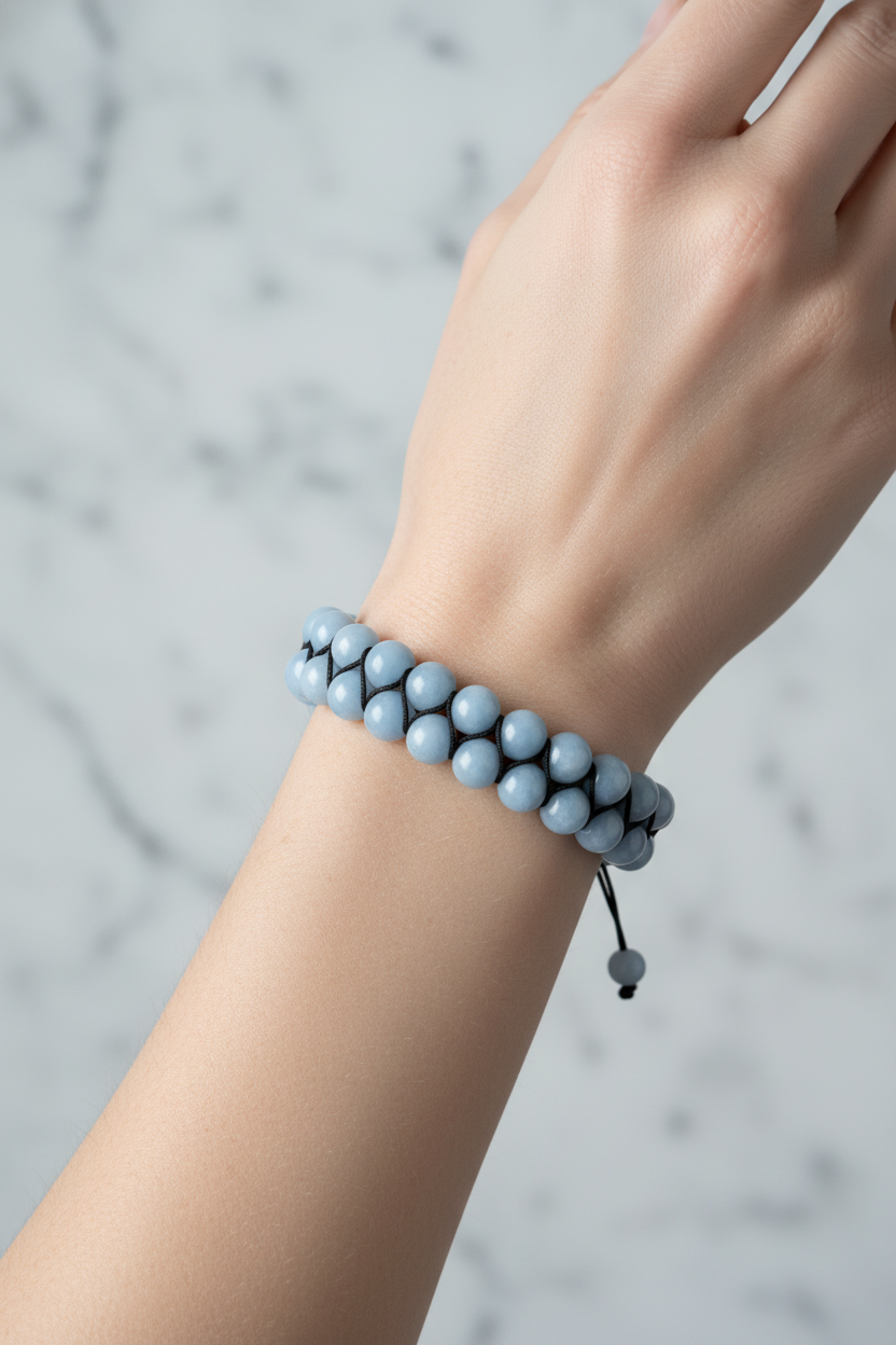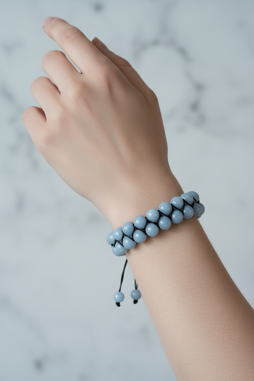 Pastel mavi tonlarıyla öne çıkan Anjelit 8mm Çift Sıra Makrome Doğal Taş Bileklik, zarif ve modern tasarımıyla bilekte sakin ve sofistike bir görünüm sunar. 8mm çapındaki doğal anjelit taşları çift sıra halinde dizilmiş, el yapımı makrome örgü tekniğiyle hazırlanmıştır. Günlük kombinlerde estetik bir detay sağlarken, özel davetlerde de şıklığınızı tamamlayan dikkat çekici bir aksesuar olarak kullanılabilir.