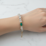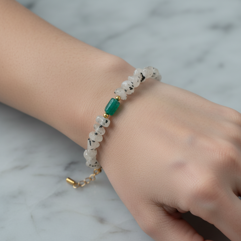 Ay taşının gizemli parıltısı ile amazonitin ferahlatıcı mavi-yeşil tonları, el işçiliğiyle hazırlanmış bu bileklikte zarif bir uyum yakalıyor. Günlük kombinlerde modern bir şıklık sunan bu özel tasarım, özel günlerde de sofistike bir tamamlayıcıdır. Doğal taşların estetik birlikteliği, tasarıma hem zarif hem de zamansız bir karakter kazandırır.