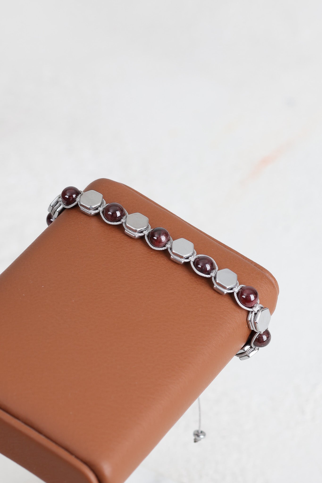 Garnet taşı, doğal kırmızı tonlarıyla sıcak ve güçlü bir görünüm sunarken; hematit taşı, gri metalik yansımalarıyla bilekliğe modern bir dokunuş kazandırır. Dayanıklı makrome örgü sayesinde uzun ömürlü kullanım sağlar ve farklı stillerle kolayca uyum yakalar.