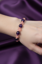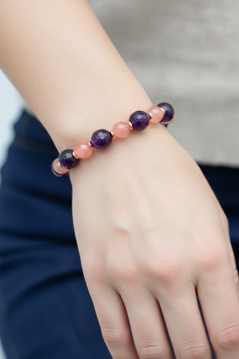 Yemen akik taşının otantik kırmızısını, ametistin zarif morunu ve hematitin güçlü parlaklığını buluşturan bu fasetli misinalı bileklik; koleksiyonuna modern, göz alıcı ve anlamlı bir parça eklemek isteyenler için ideal seçimdir.