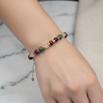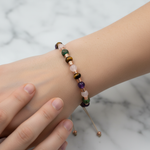 Hematitin modern metalik parlaklığı, pembe kuvarsın romantik tonları, krizokolun özgün mavi-yeşil dokusu, ametistin mor zarafeti ve kaplan gözünün altın kahverengi yansımaları el işçiliğiyle birleşerek sofistike bir bileklik tasarımına dönüşüyor. Günlük kombinlerde zarif bir şıklık sunan bu özel parça, özel günlerde de güçlü ve özgün bir tamamlayıcıdır.