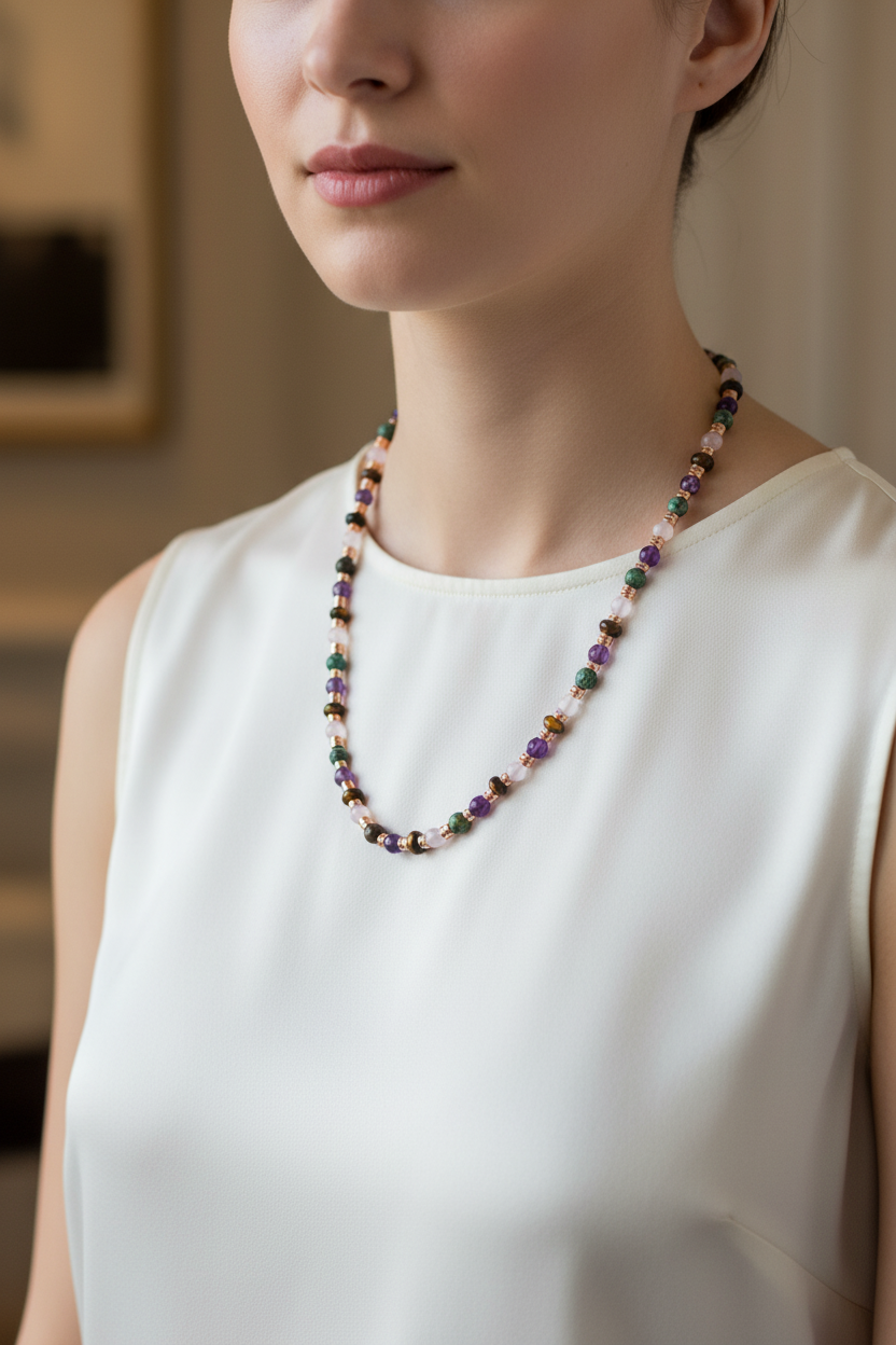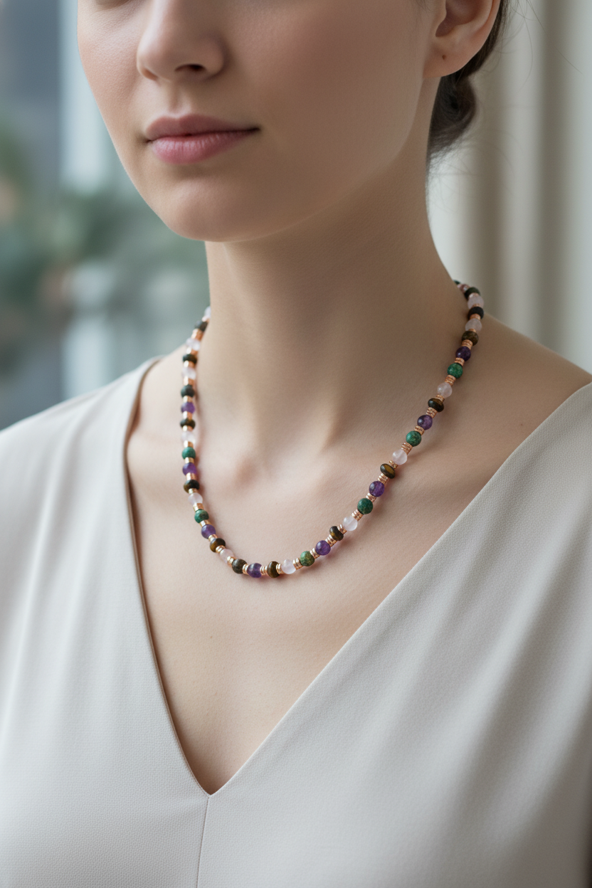 Hematitin metalik parlaklığı, pembe kuvarsın romantik tonları, krizokolun özgün mavi-yeşil dokusu, ametistin mor zarafeti ve kaplan gözünün altın kahverengi yansımaları bir araya gelerek sofistike bir kolye tasarımı oluşturuyor. El işçiliğiyle özenle hazırlanmış bu özel parça; günlük kombinlerde modern bir şıklık sunarken, özel günlerde de zarif bir tamamlayıcıdır. Doğal taşların kontrast uyumu, tasarıma özgün bir karakter kazandırır.