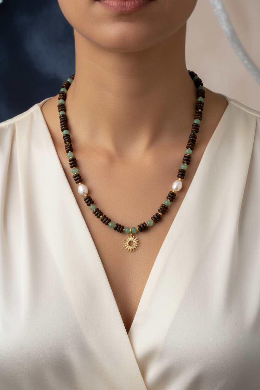 Doğallığın zarafetle birleştiği bu özel tasarımda, hindistan cevizi kabuğunun organik dokusu, yeşil aventurinin canlı tonları ve incinin zamansız ışıltısı bir araya geliyor. 925 ayar gümüş detaylarla tamamlanan kolye, el işçiliğiyle özenle hazırlanmıştır. Günlük kombinlerde farklı ve özgün bir dokunuş katarken, özel günlerde de sofistike bir stil tamamlayıcısıdır.