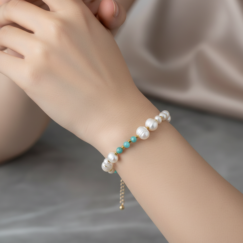 İnci & Amazonit Doğal Taş Altın Kaplama Kapama Bileklik – El İşçiliği